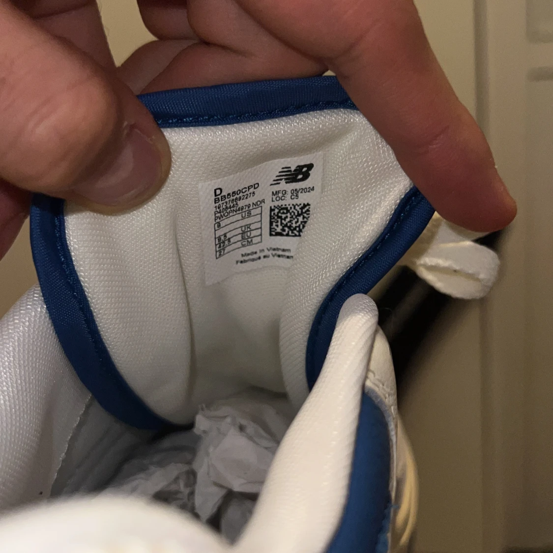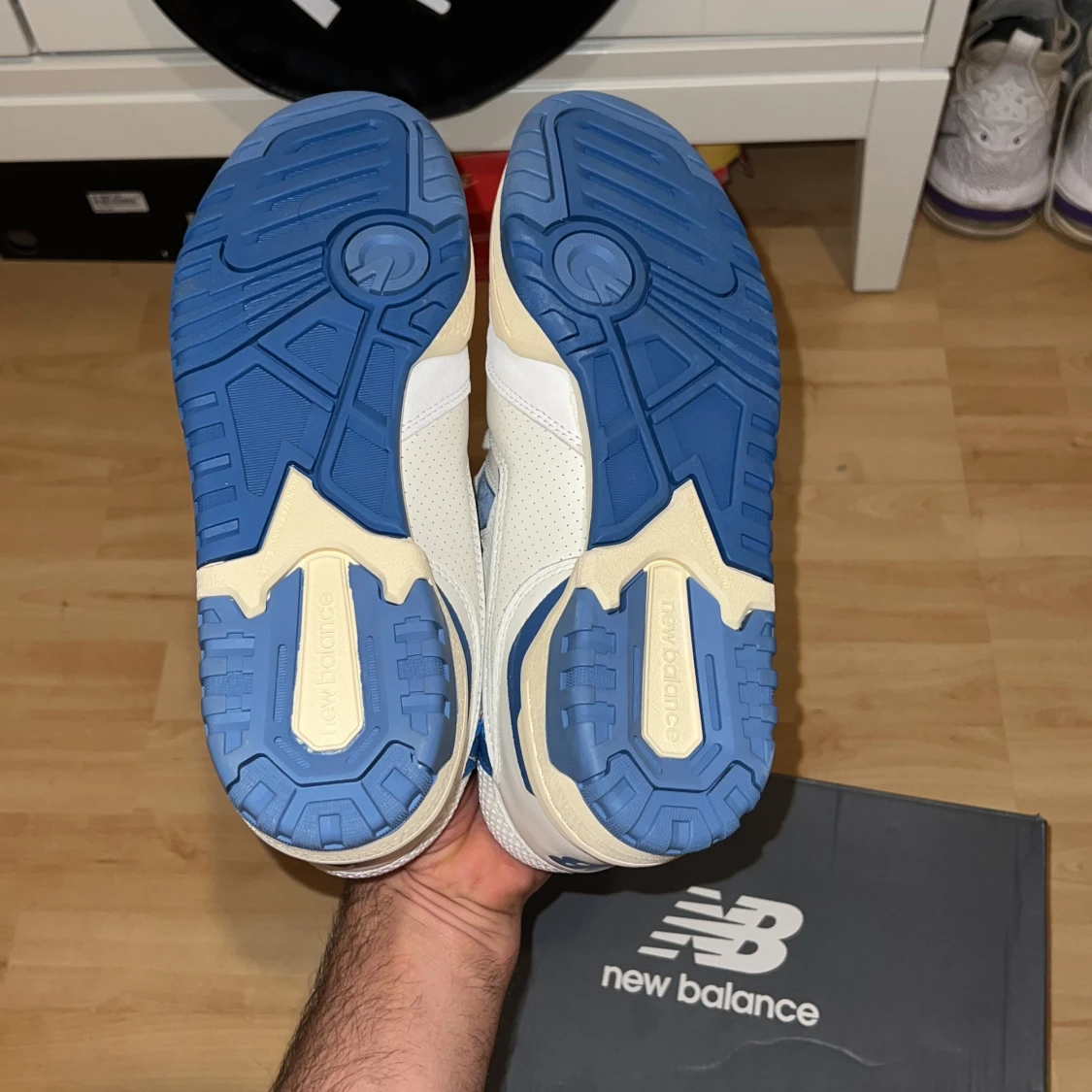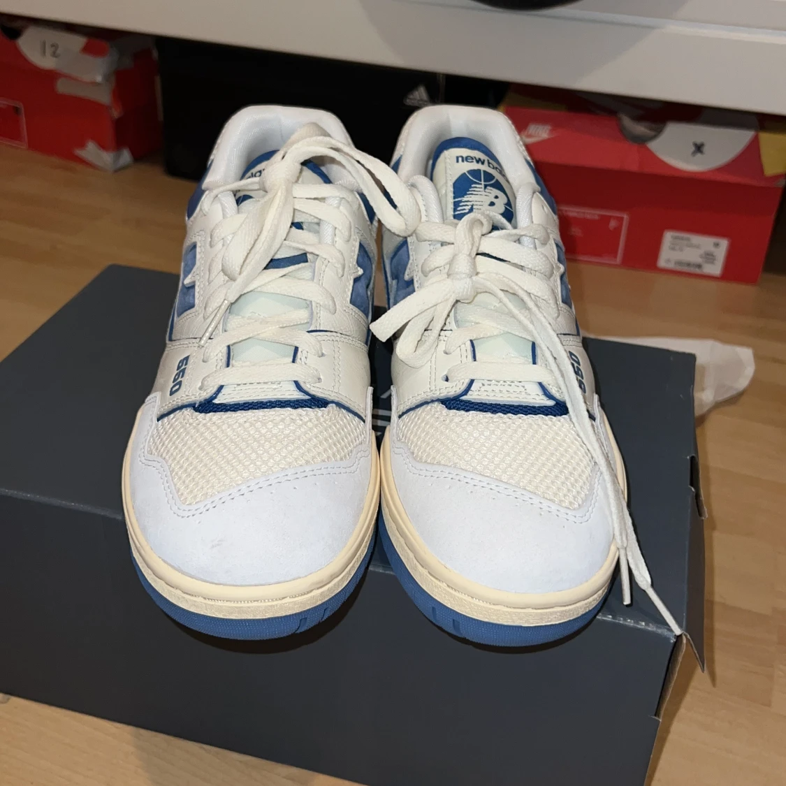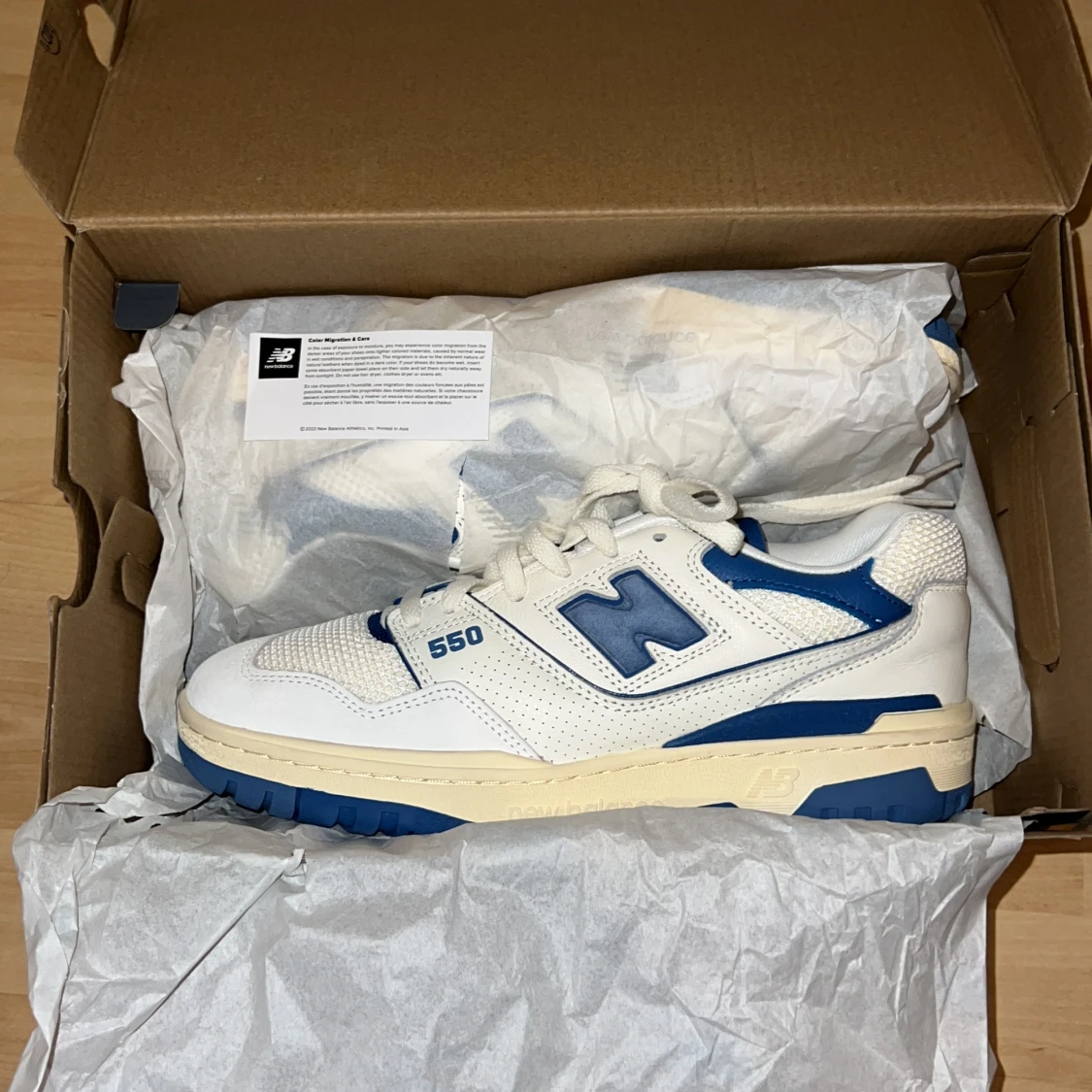 Snygga New Balance 550 sneakers i vitt och blått med klassisk snörning. De är helt nya, oanvända. Dem är storlek 42,5. Priset kan diskuteras.