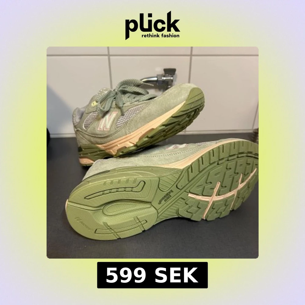 Säljer ett par New Balance 993 JFG sneakers i ljusgrön mocka och mesh med beige och gröna detaljer. Skorna har snörning, platt sula och rund tå. Ikoniskt N på sidan med rosa kant, och JFG-logga på hälen. Perfekt för dig som gillar stilrena och unika sneakers.