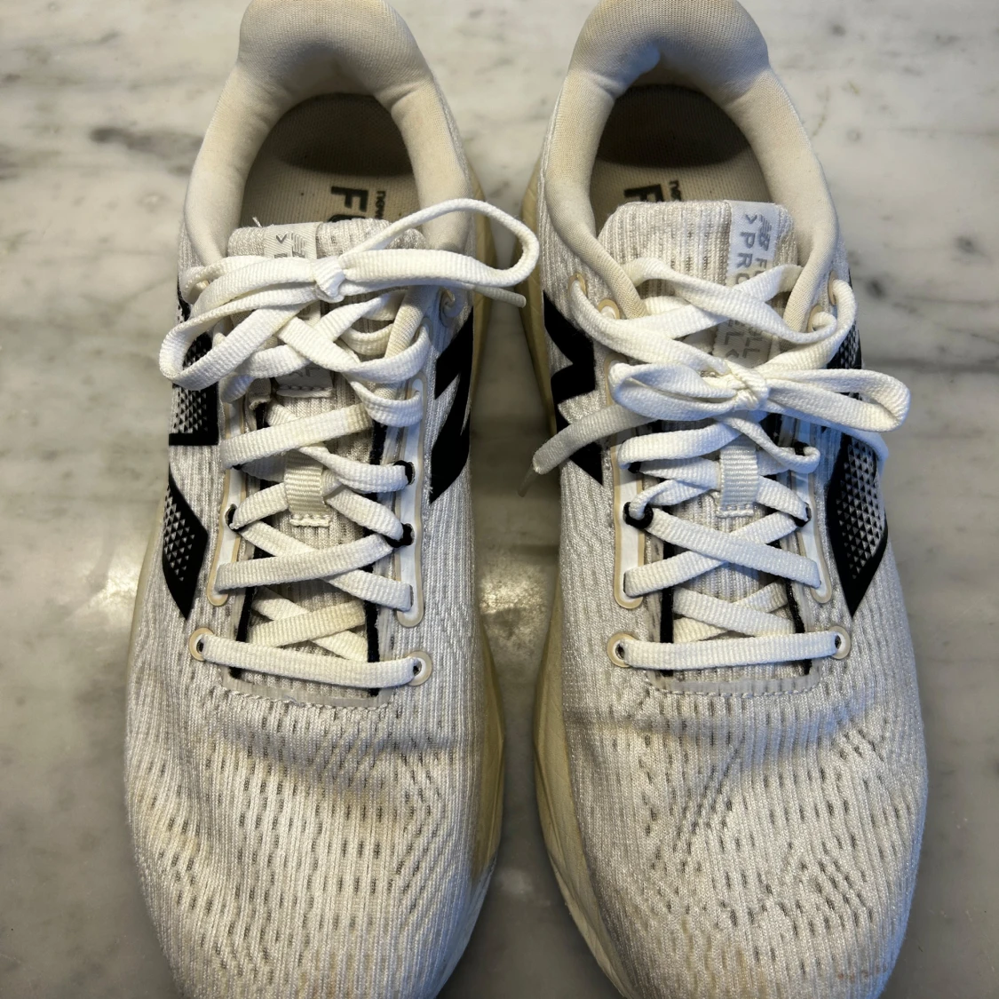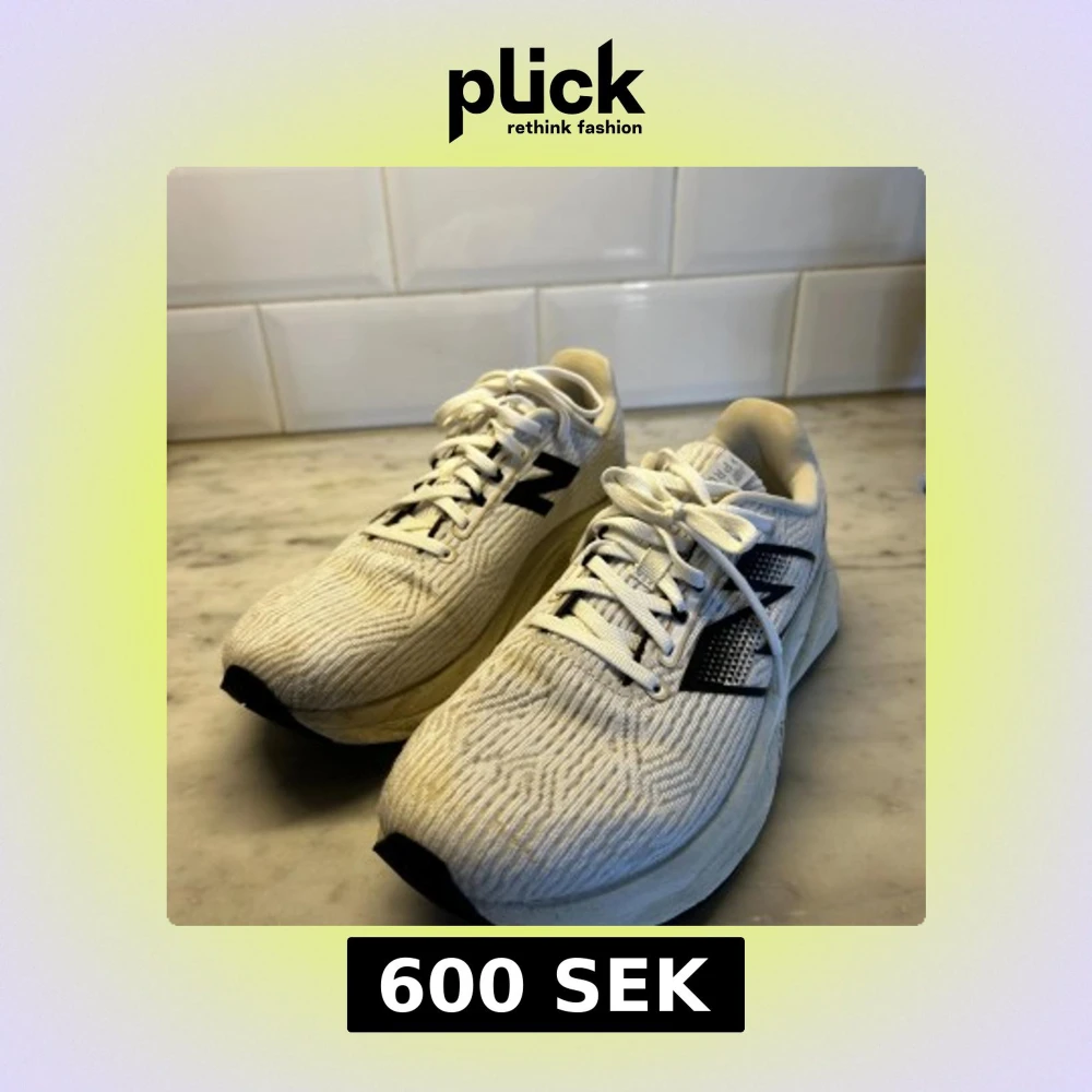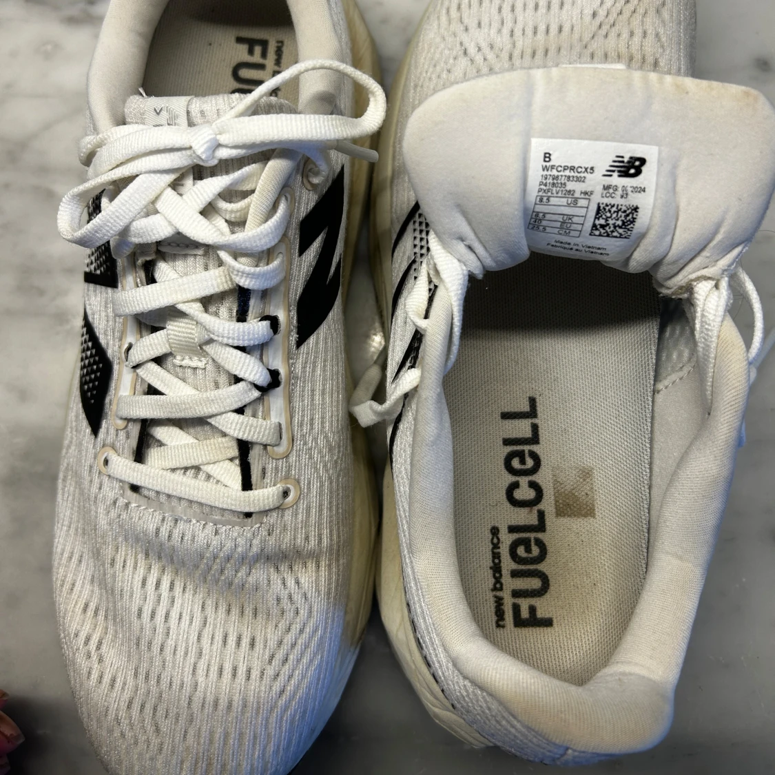 Säljer ett par vita New Balance FuelCell sneakers med svart logga på sidan. Skorna är i syntetmaterial med stickad ovandel. Perfekta för dig som gillar sportig stil och vill ha bekväma skor till träning eller vardag.