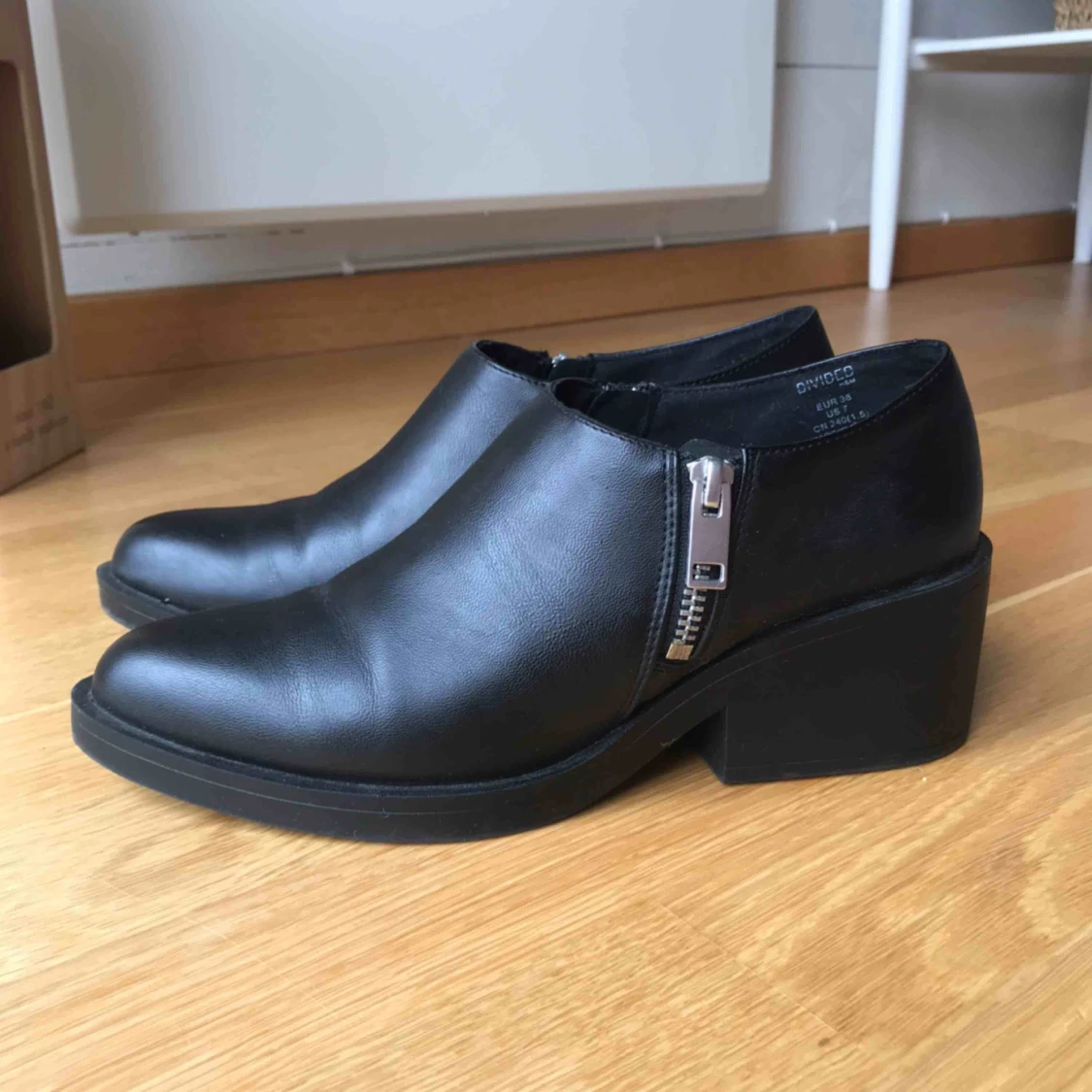 Väldigt snålt använda skor (ca 1-2ggr) från Divided, strl 38. Dragkedjorna funkar bra och inte en enda repa i skinnet (ej äkta läder). Cool form med de lågt skurna sidorna och det spetsiga framtill. Frakt tillkommer på 72kr 🖤
