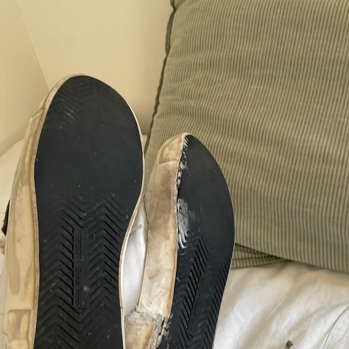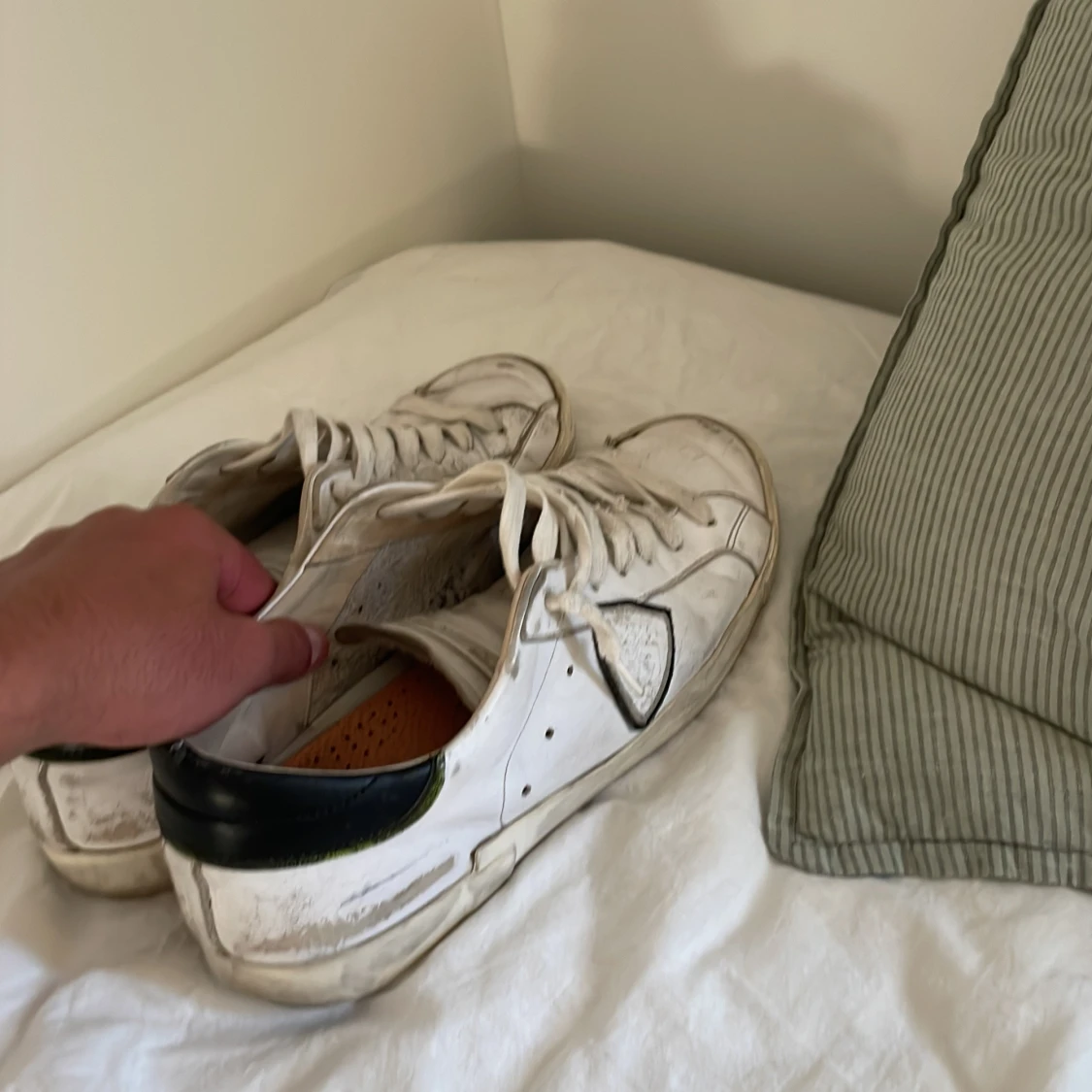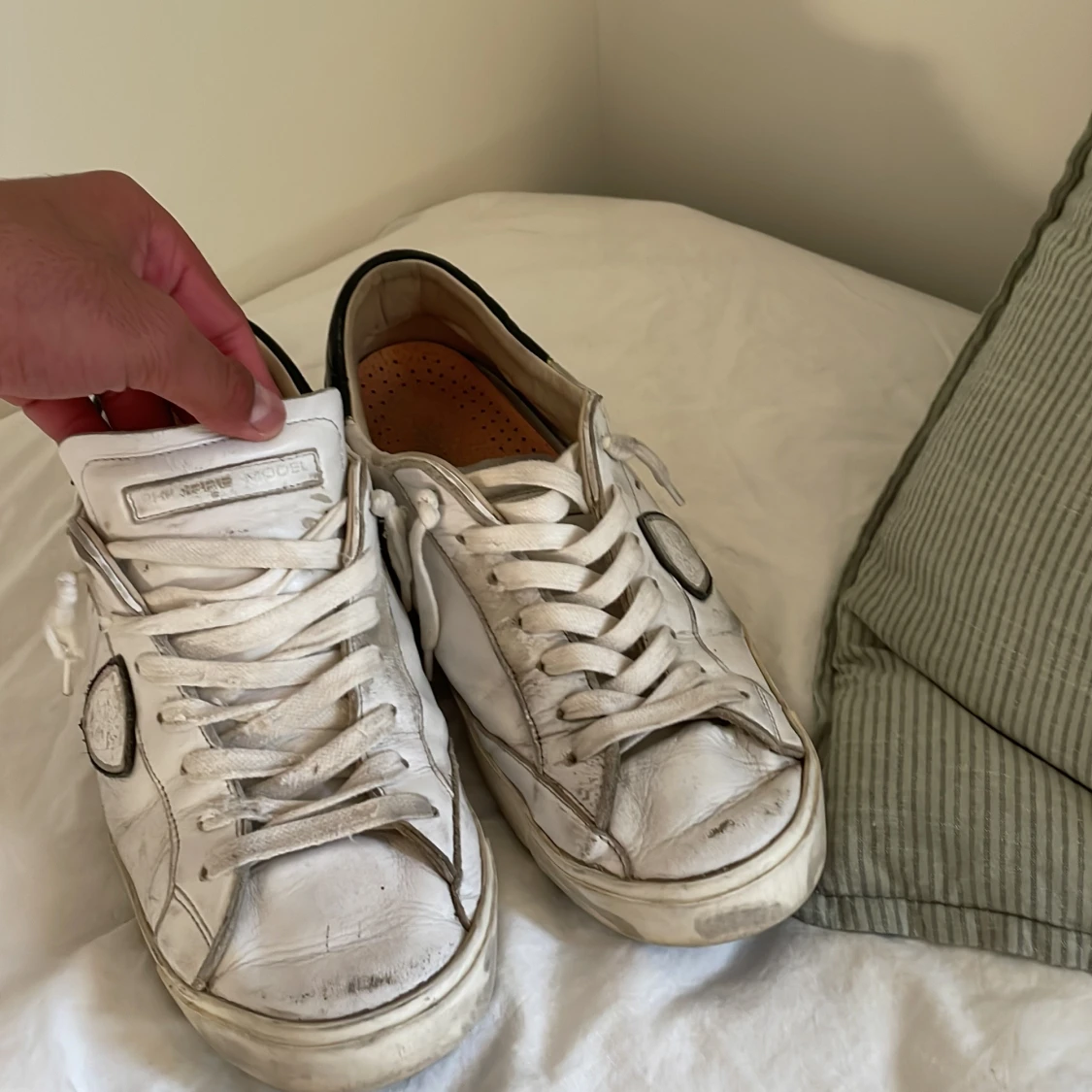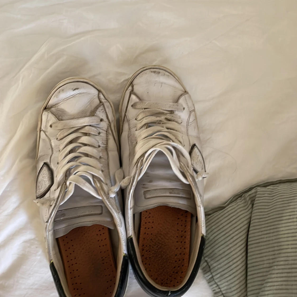 Säljer ett par vita sneakers med svarta detaljer. De har snörning och är i välanvänt skick. Perfekta för en casual look! sulan e lite sönder men går jätte bra att gå i