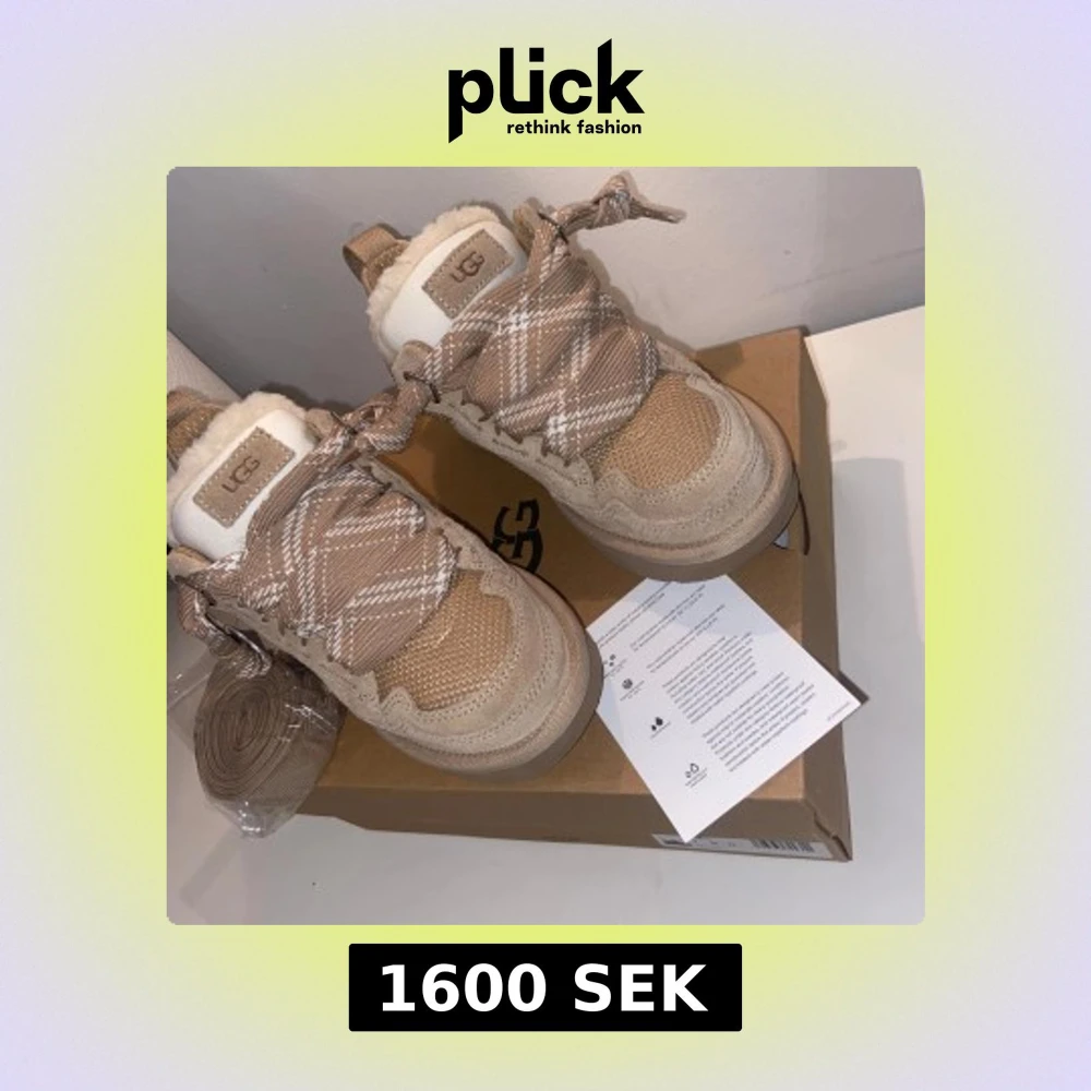 Snygga beige sneakers från UGG med breda, rutiga snören och mysigt vitt fårfoder på insidan. Ovandelen är i mocka och textil, med detaljer i vitt och en rejäl platt sula. Perfekta för höst och vinter när du vill hålla stilen och värmen.