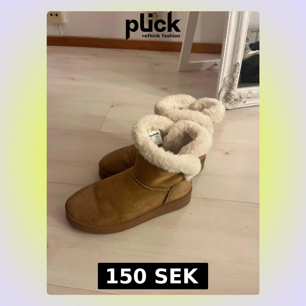 Mysiga boots i beige mocka med fluffigt ljust pälsfoder runt kanten. Skorna har platt sula och rund tå, perfekt för kalla dagar. De är låga och har en enkel design utan snörning eller dragkedja. Snygga att matcha med jeans eller leggings.