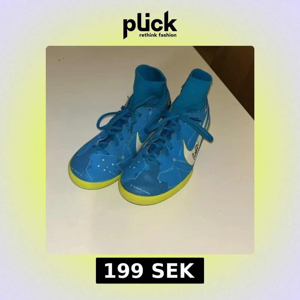 Säljer ett par blå Nike Mercurial fotbollsskor med gula detaljer och snörning. Skorna har en hög ankelkrage och vit Nike-logga på sidan. Perfekta för inomhusfotboll och designade med Neymar-inspirerade detaljer. De är signerade av free skillers!
