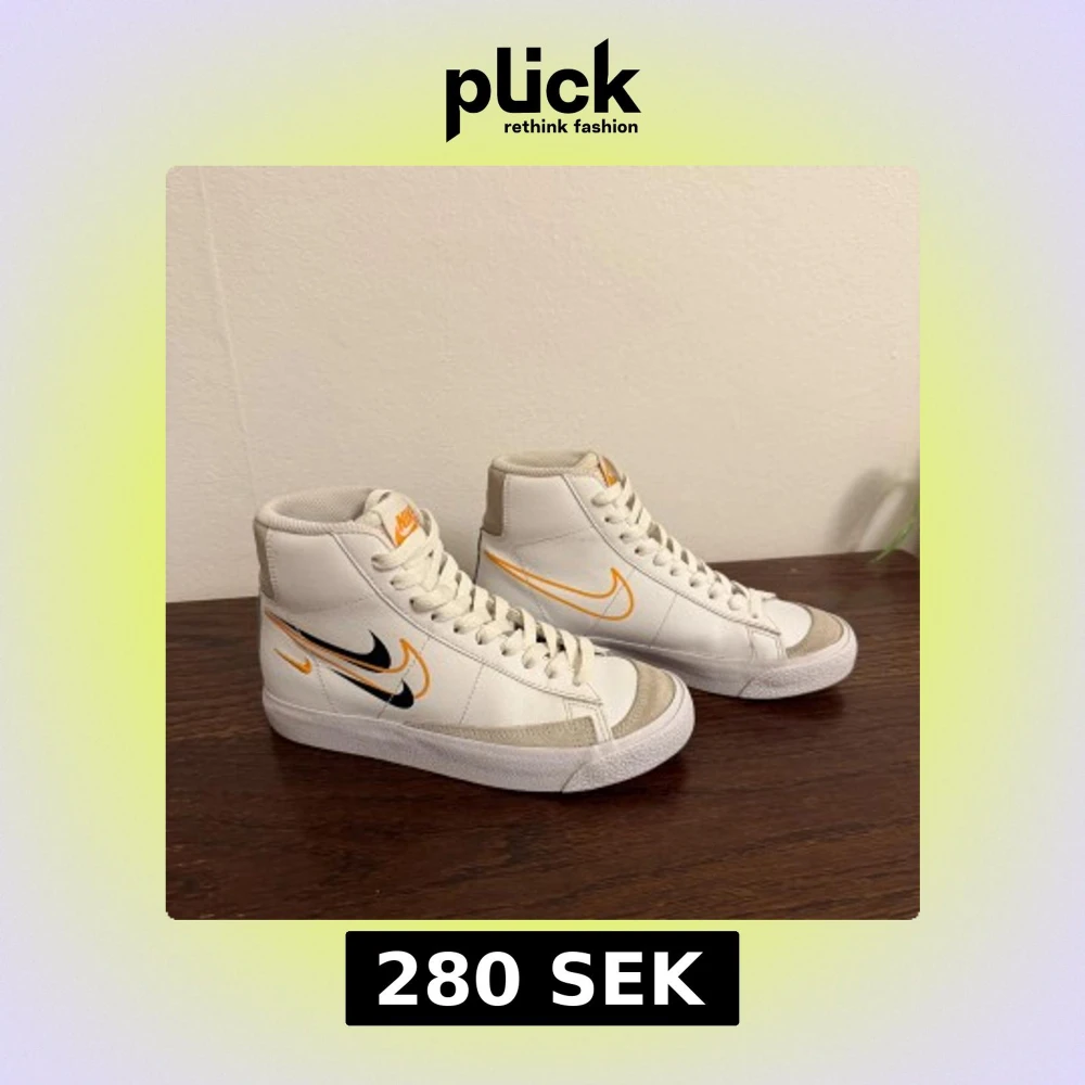 Nike Blazer Mid sneakers i vitt skinn med orange och svart swoosh-detalj på sidorna. Klassisk hög modell med snörning och beige mockadetaljer vid tån och hälen. Snygg retrostil som sticker ut med flera swoosh-loggor och orange Nike-märke på plösen.