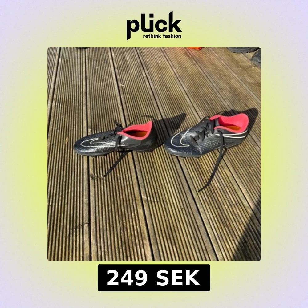Snygga svarta fotbollsskor från Nike med vita detaljer och en röd insida. Skorna har snörning och en modern design som passar perfekt för fotbollsplanen.