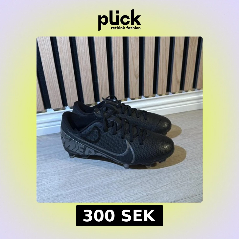 Säljer ett par svarta Nike Mercurial fotbollsskor med snygga silverdetaljer och texten 'JUST DO IT' på hälen. Skorna har snörning, platt sula med dobbar och rund tå. Ovandelen är tillverkad i syntetmaterial som ger bra känsla på planen.