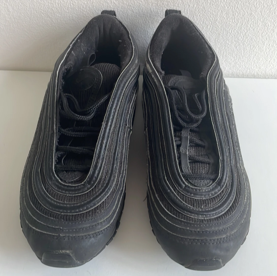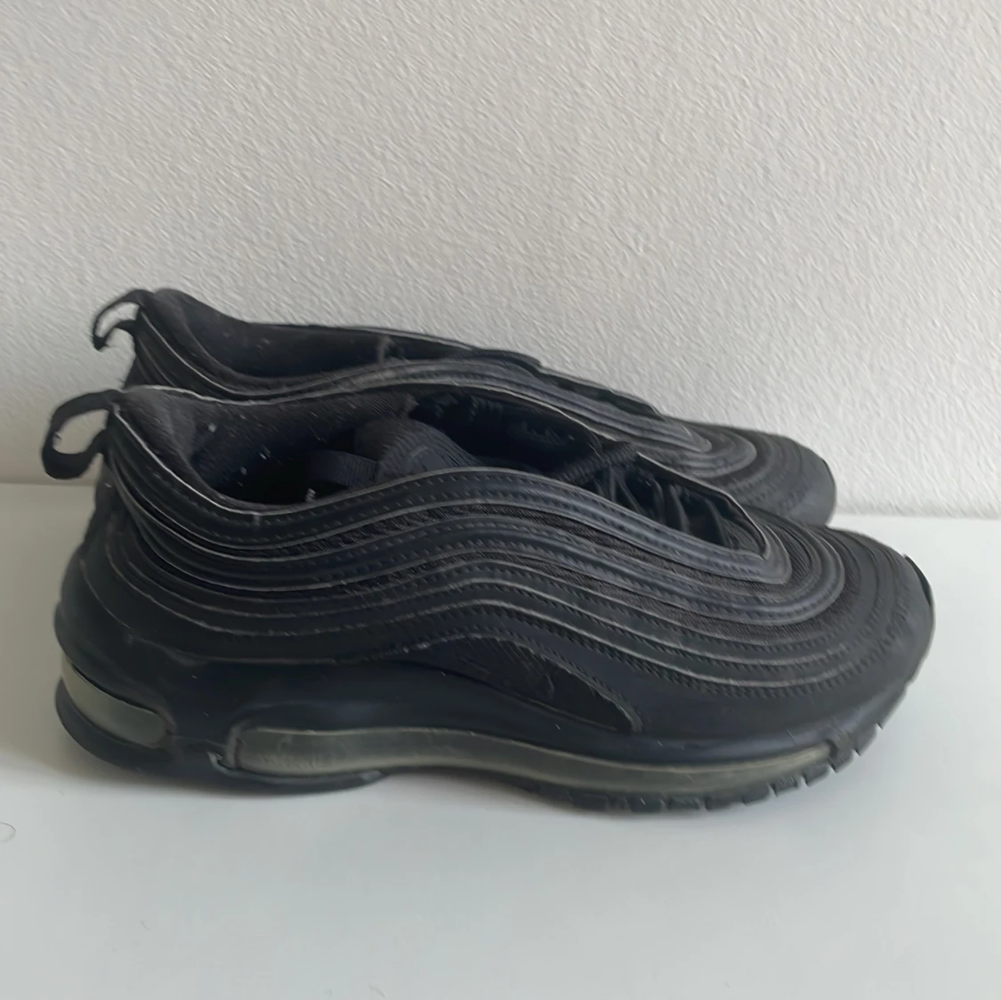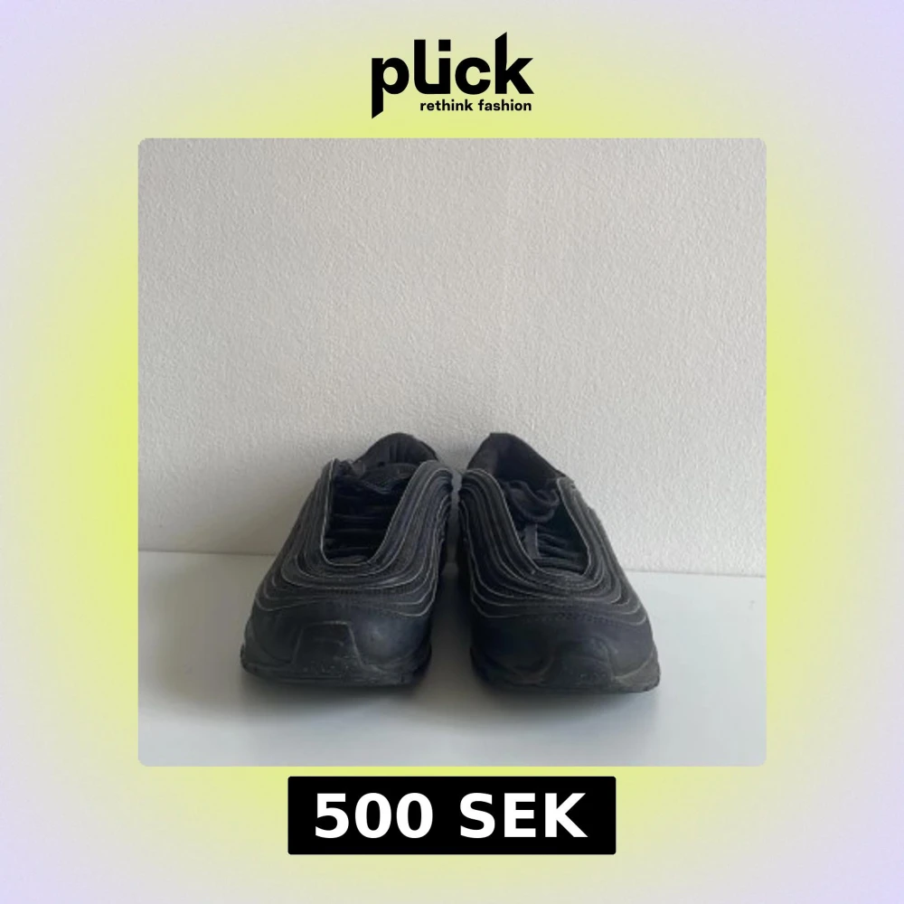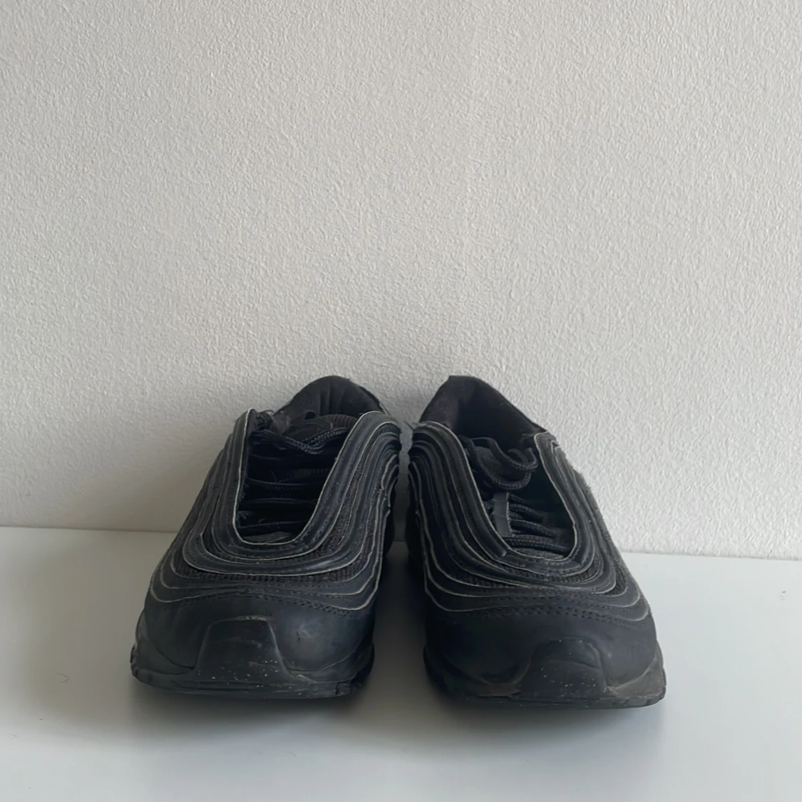 Svarta Nike Air Max 97 med ikoniska vågformade linjer och synlig Air-sula. Skorna har snörning och en sportig vibe, tillverkade i syntet och textil. Perfekta för dig som gillar streetstyle och vill ha en klassisk sneaker med modern känsla.