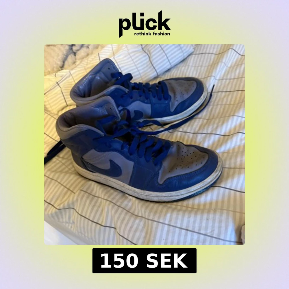 Säljer ett par blå och grå Nike Air Jordans sneakers med högt skaft och klassisk swoosh-logga på sidan. Skorna har snörning och rund tå, perfekt för dig som gillar streetstyle och sportig look.
