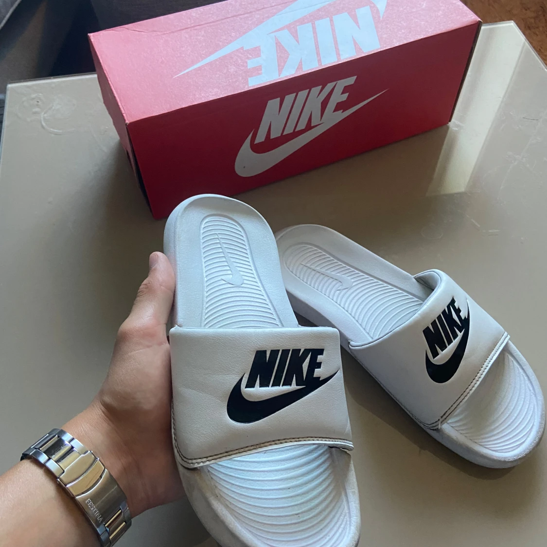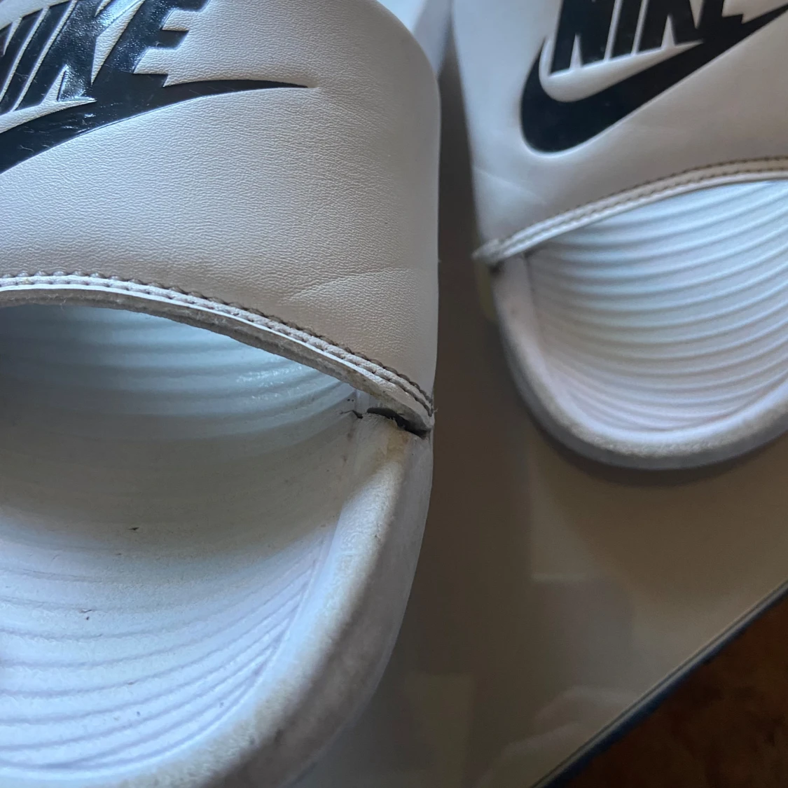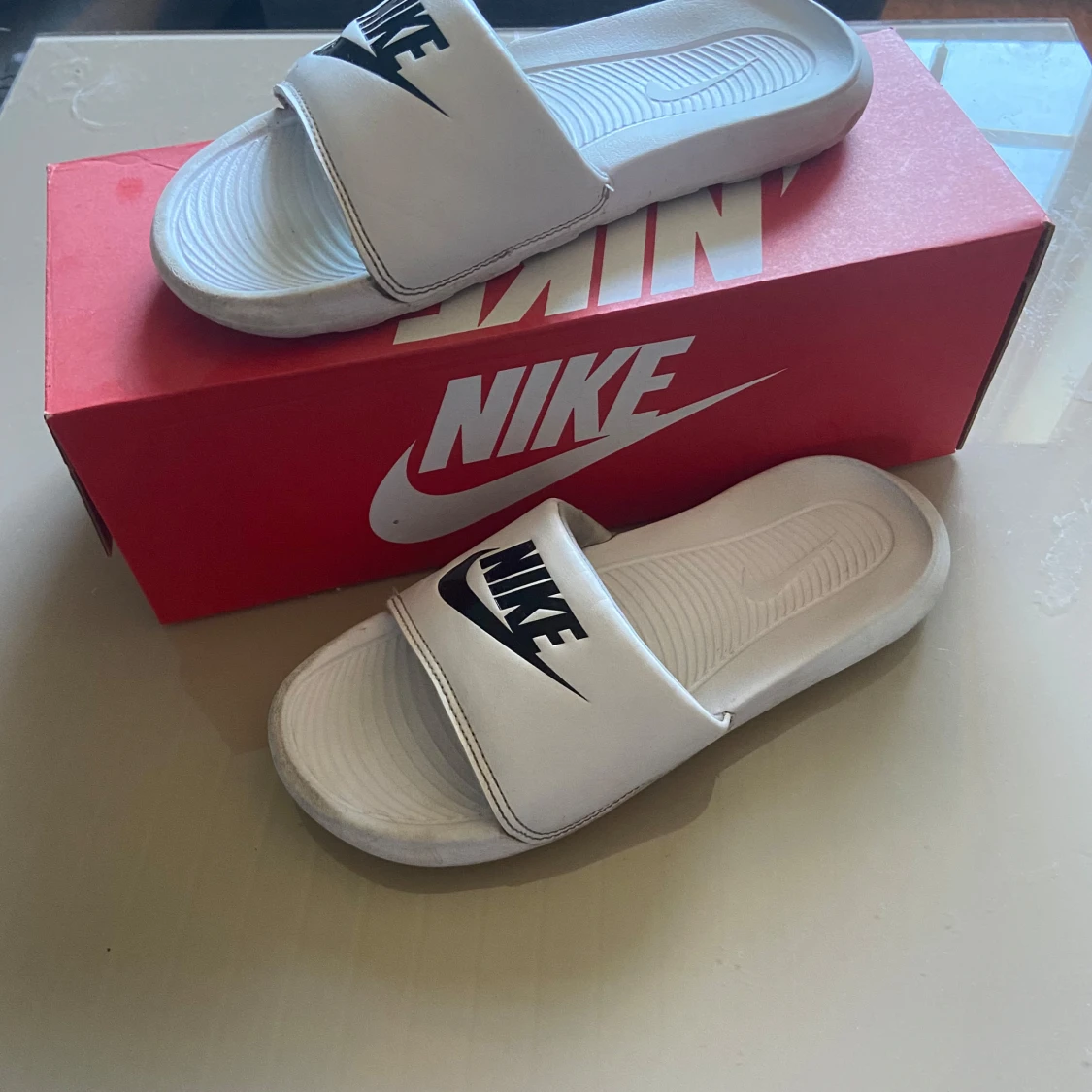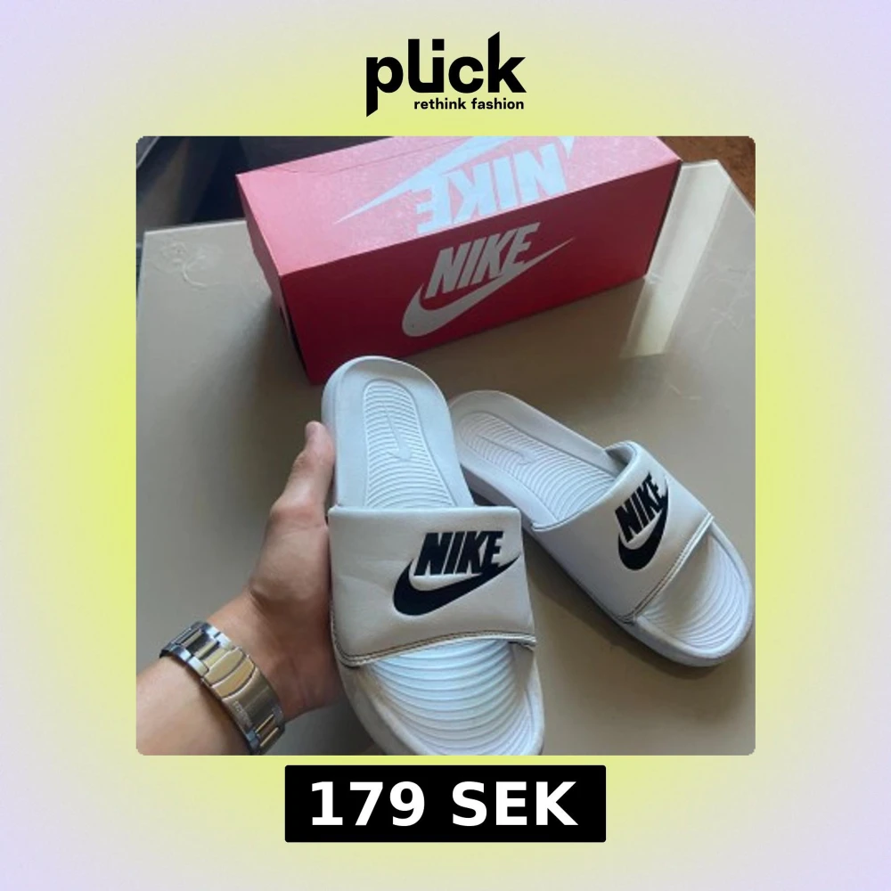 Vita Nike tofflor med svart logo