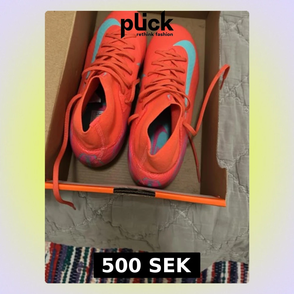 Säljer ett par riktigt snygga neonrosa fotbollsskor med turkosa detaljer och snörning. Skorna har en smal och sportig form med dobbar i plast för bra grepp på planen. Perfekta för dig som vill sticka ut på fotbollsplanen!