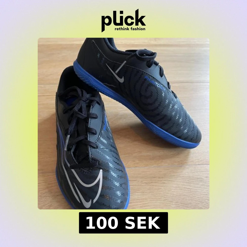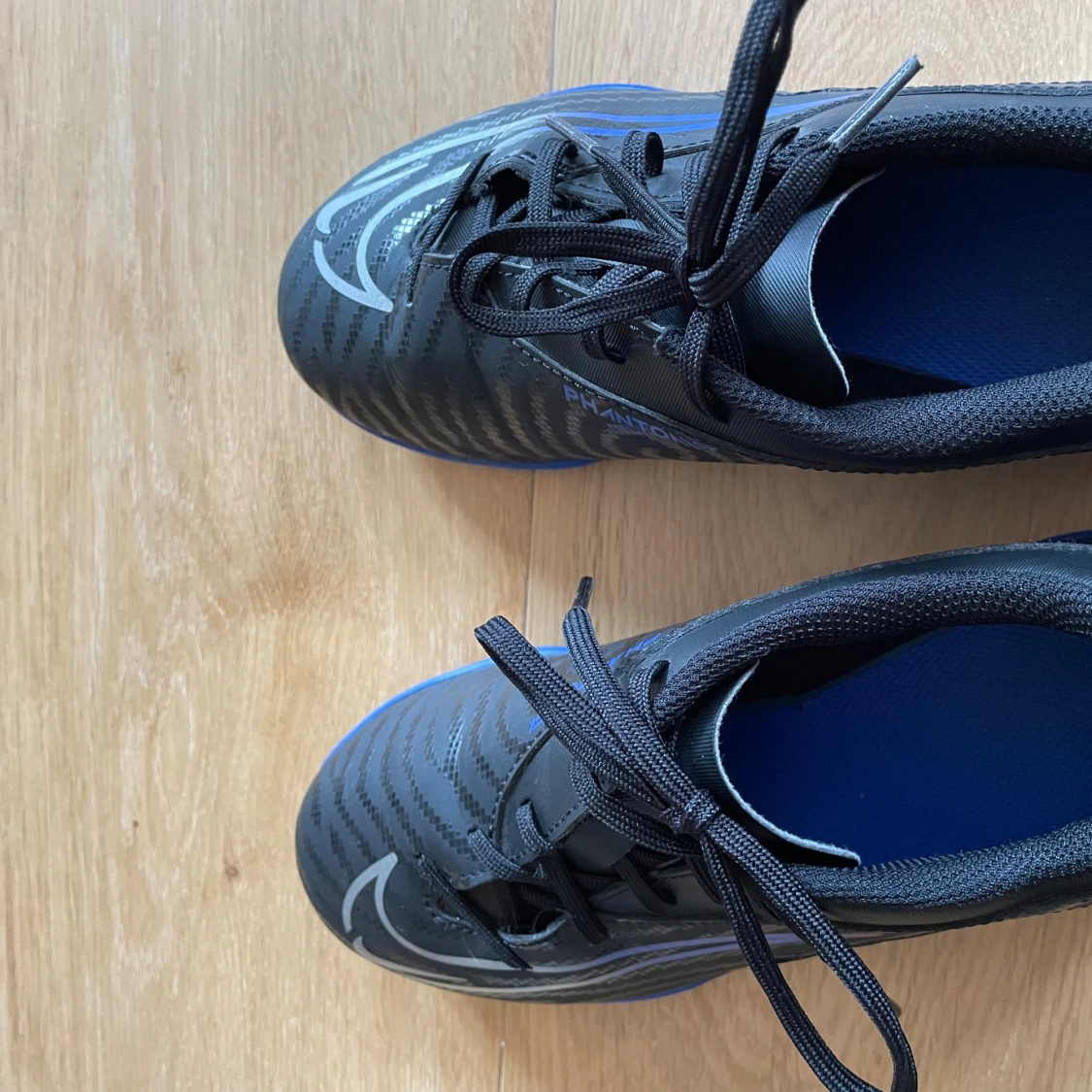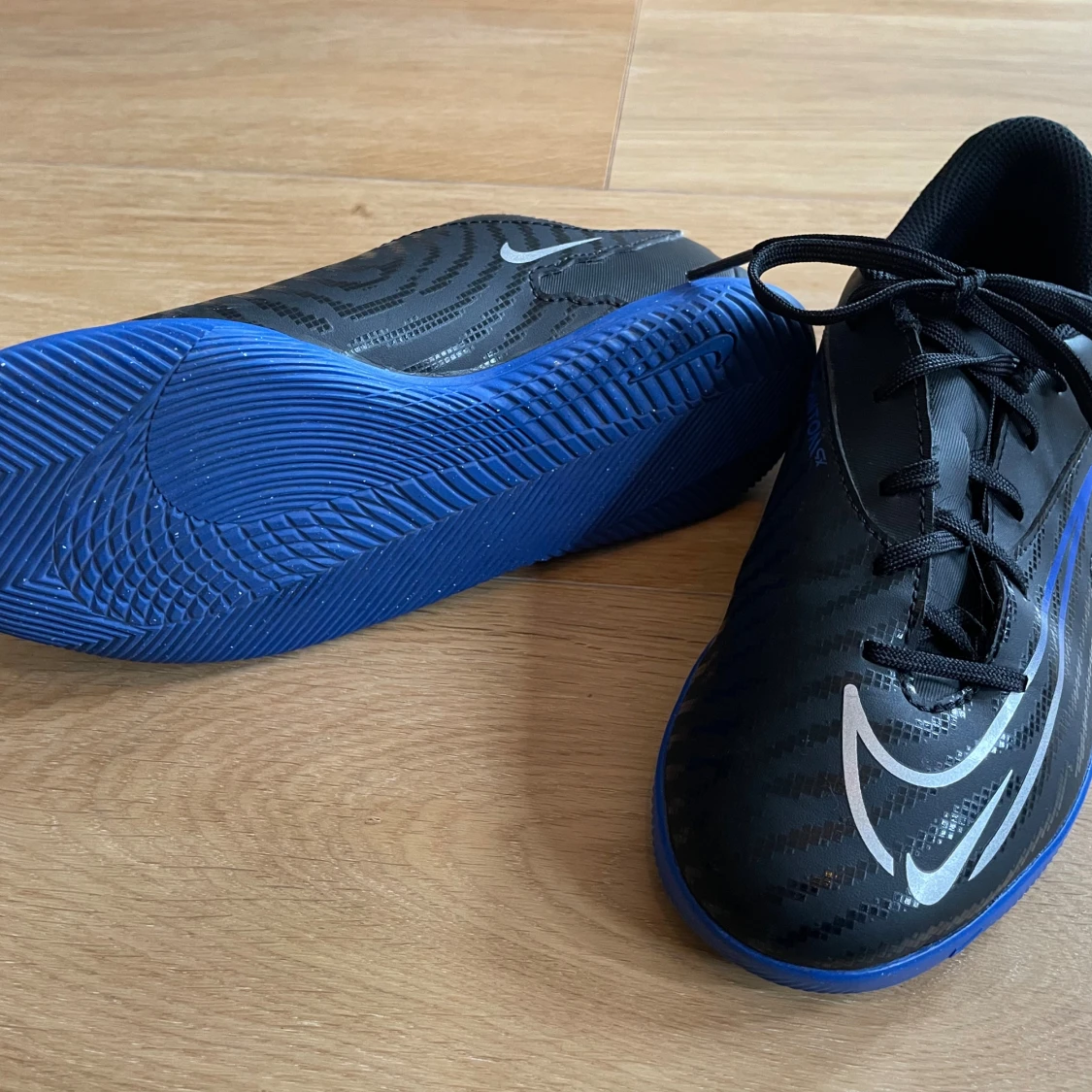 Säljer ett par Nike Phantom gx fotbollsskor för inomhusspel. Svarta med blå sula och silverfärgade detaljer. Skorna har snörning och ett mönster över hela ovandelen. Perfekta för inomhusspel med sin platta, greppvänliga sula och sportiga look.