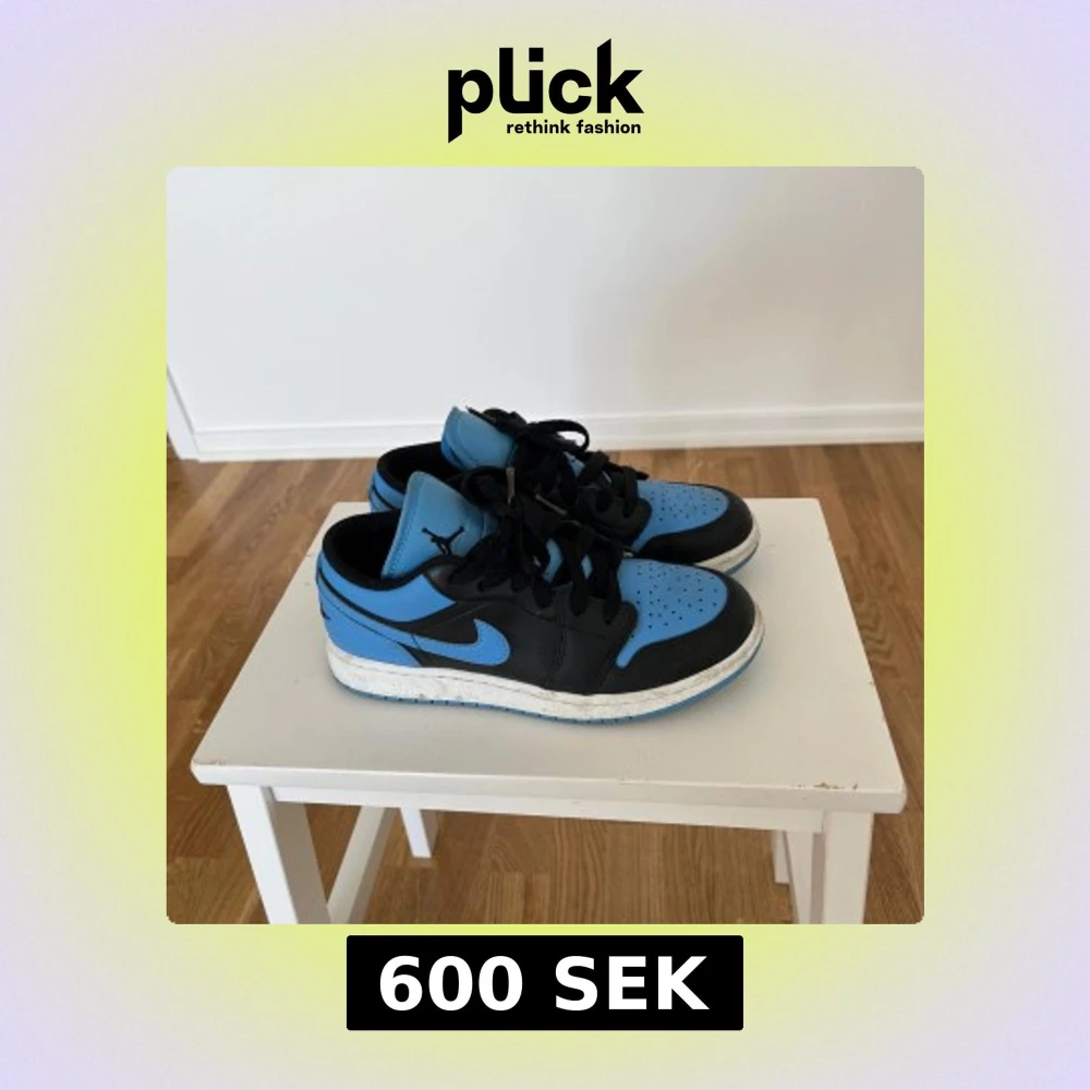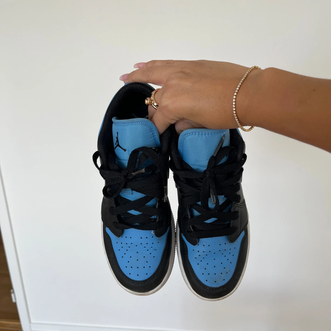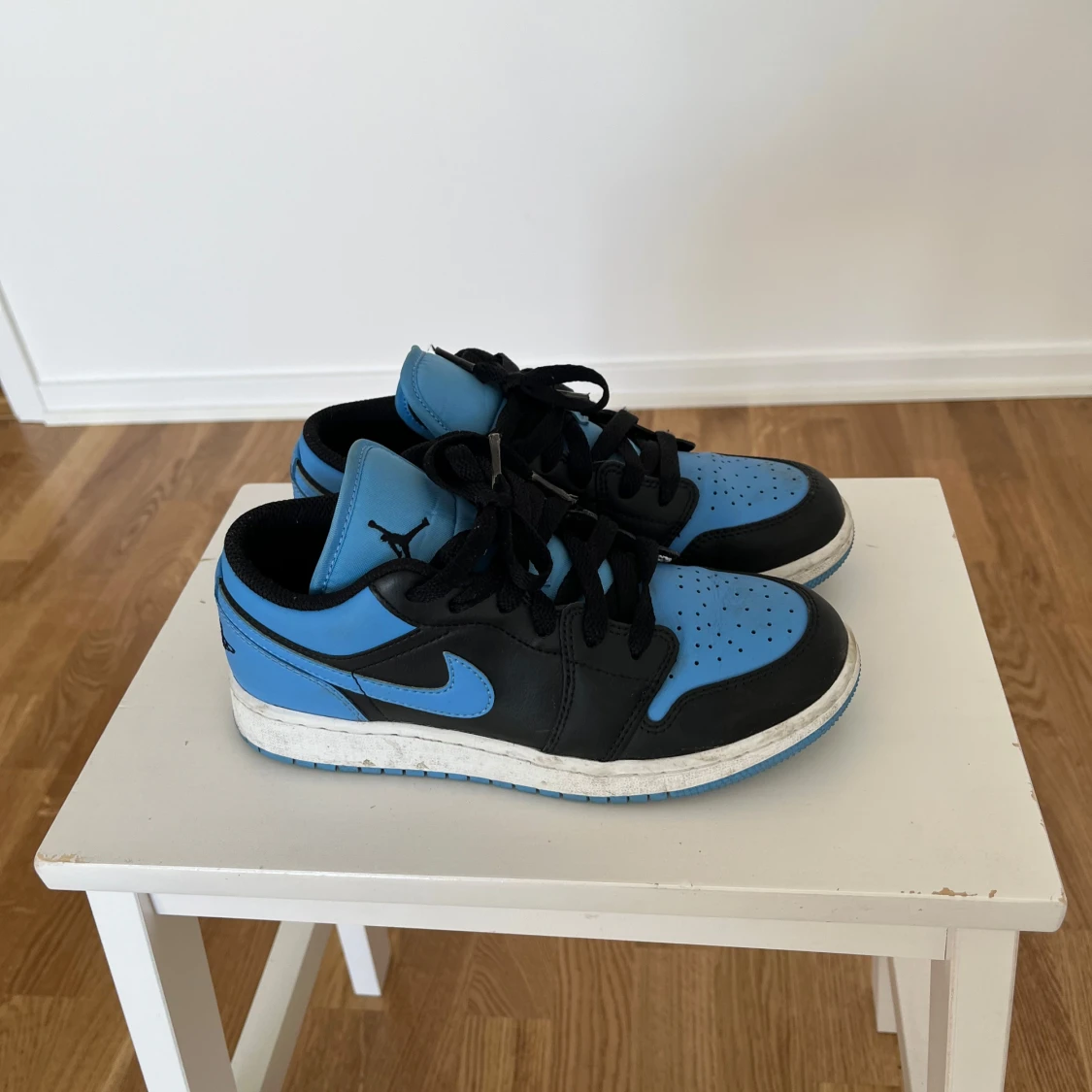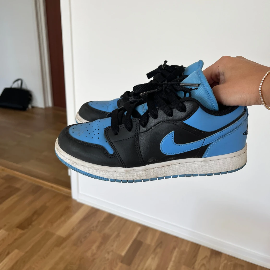 Säljer ett par Nike Jordan 1 Low sneakers i blått och svart. Jättefina men används inte längre.