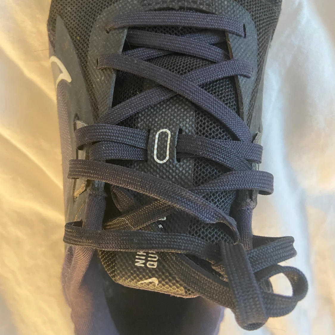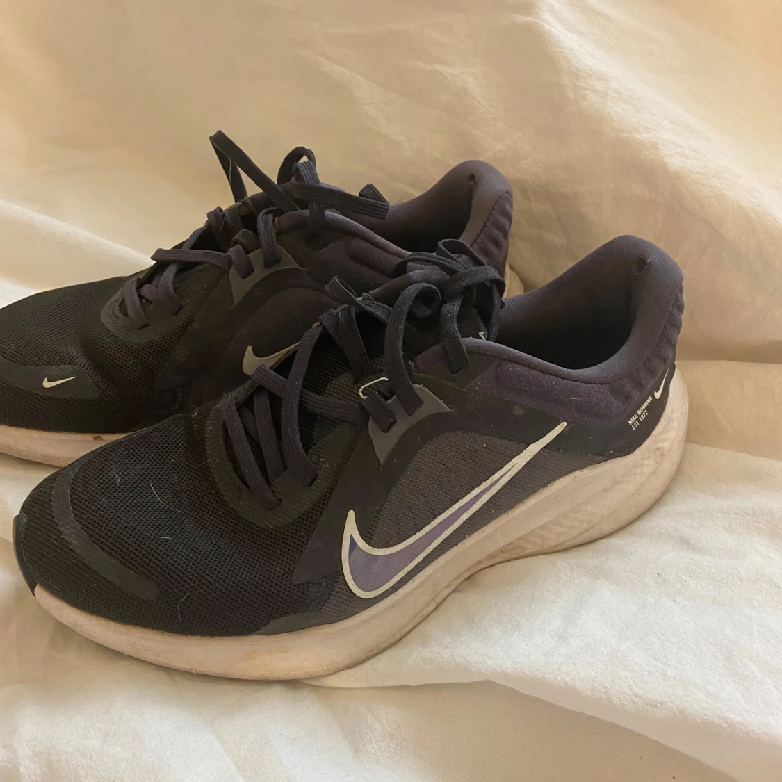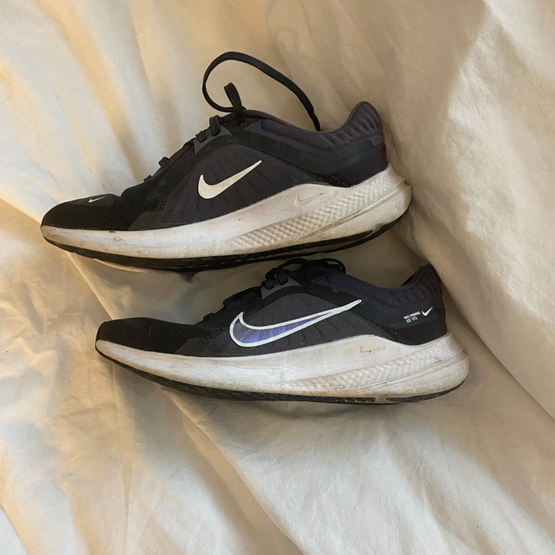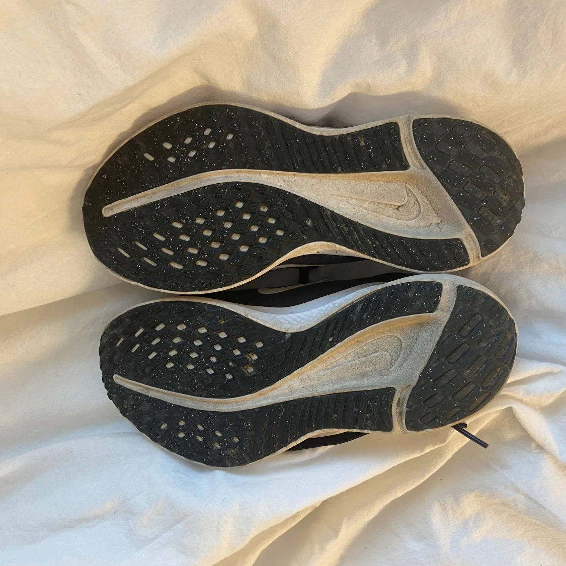 Säljer ett par svarta Nike sneakers med vit swoosh och detaljer. Skorna har mesh-ovandel för bra ventilation, snörning och en tjock, vit och svart sula med mönstrad undersida. Perfekta för träning och löpning, riktigt sköna och snygga på foten.