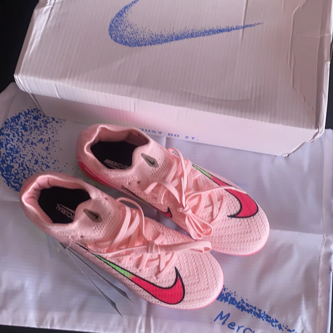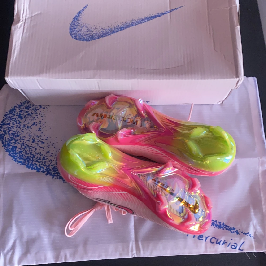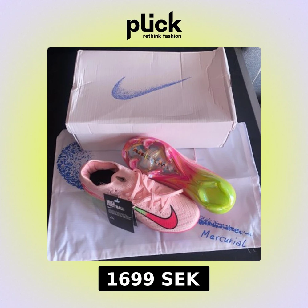 Nike Mercurial Air Zoom fotbollsskor i ljusrosa med en stor rosa och svart swoosh på sidan. Sulan har ett galet färgglatt mönster i neonrosa, gult, grönt och blått. Ovandelen är i syntetmaterial med snörning och en låg profil. Perfekt för dig som vill sticka ut på planen.