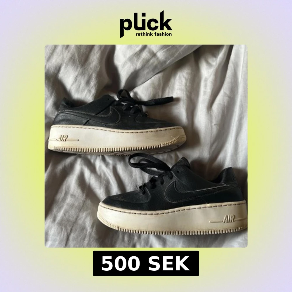 Svarta Nike Air Force 1 sneakers med vit, chunky plattformssula. Klassisk låg modell i skinn med snörning och perforerade detaljer på tån. Swoosh-logga på sidan och AF-1-detaljer på plösen och hälen. Perfekta för en clean streetstyle-look.
