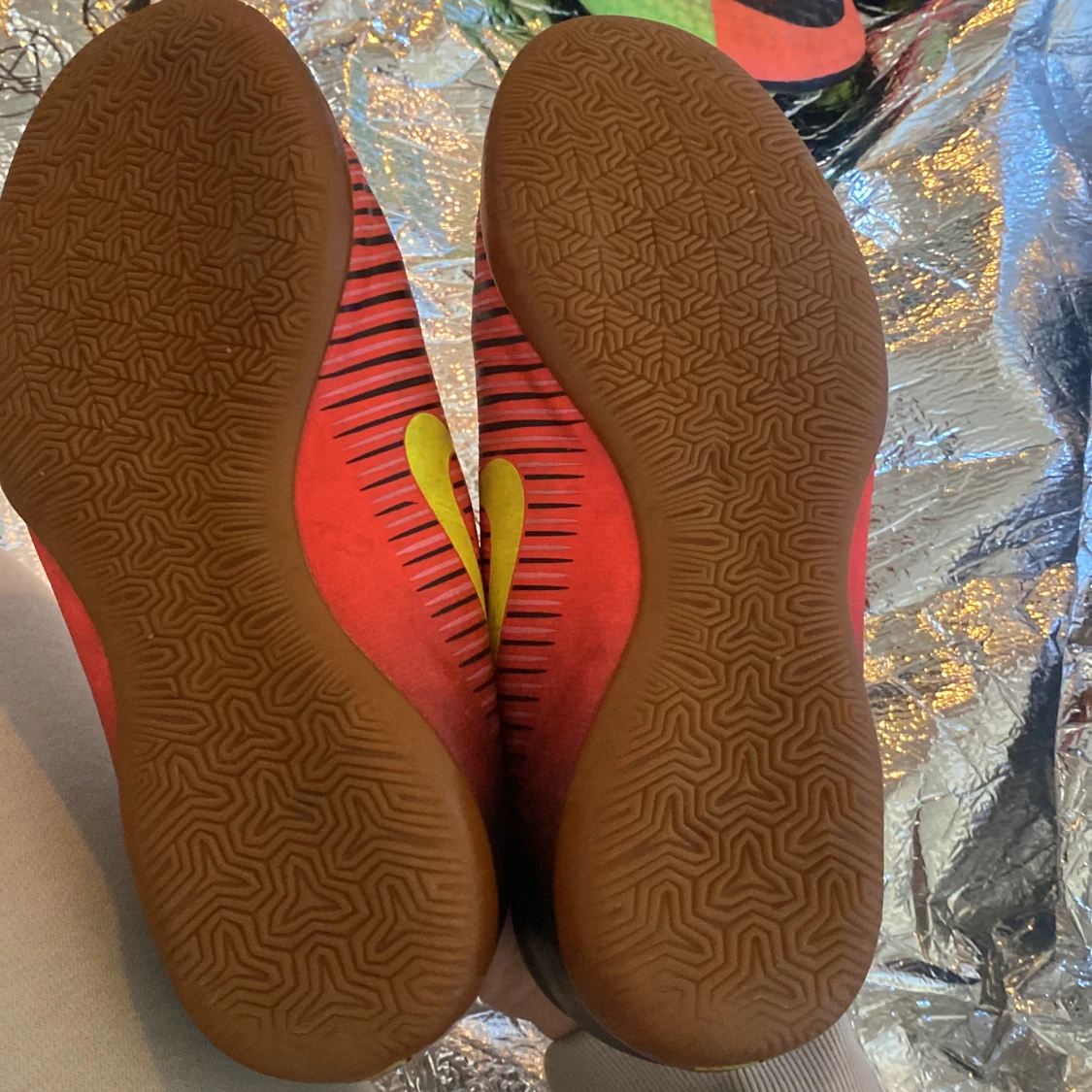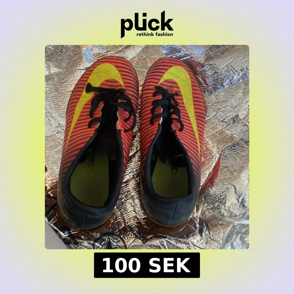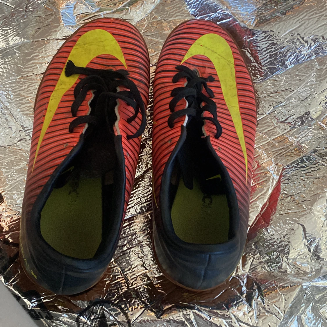 Säljer ett par Nike fotbollsskor med röd bas och svarta ränder samt en stor gul Nike-swoosh på sidan. Skorna har snörning och platt sula, perfekt för inomhusspel. Insidan är grön och yttersulan är brun.