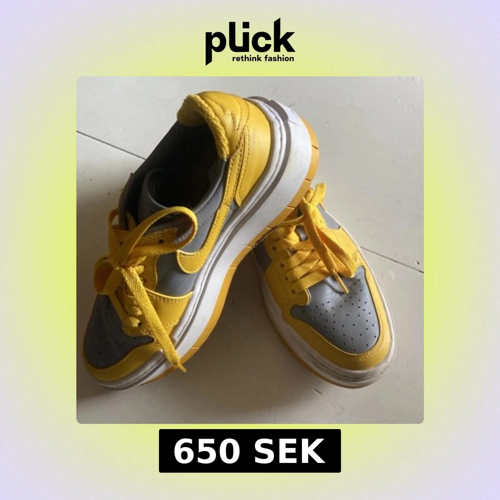 Nike Jordan 1 Low sneakers i en fet gul och grå färgkombo med vit sula och platt profil. Skorna har snörning, rund tå och klassisk Jordan-logga på hälen. Ovandelen är i skinn och detaljerna är riktigt snygga med kontrasterande färger och tydliga sömmar.