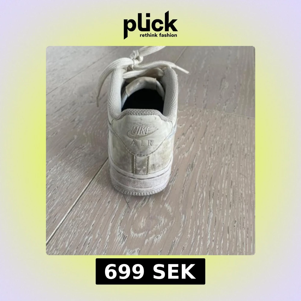 Klassiska Nike Air Force 1 sneakers i vitt med beige swoosh. Skorna har snörning, perforerad tå och platt sula. Perfekta för en stilren och sportig look.