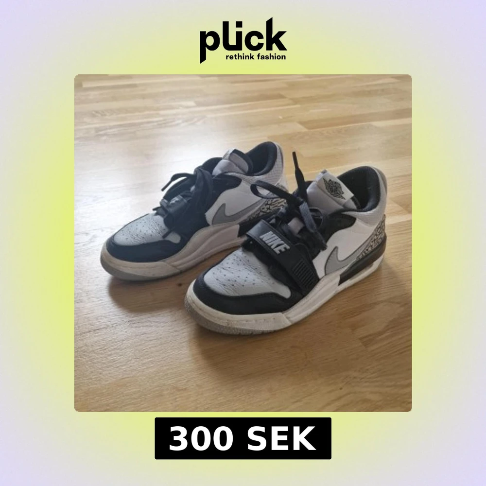 Säljer ett par Nike Air Jordan sneakers i svart och vitt med klassisk logga på hälen och coolt mönster på sidorna. Skorna har snörning och en bred rem över vristen med Nike-tryck. Perfekta för dig som gillar streetstyle.