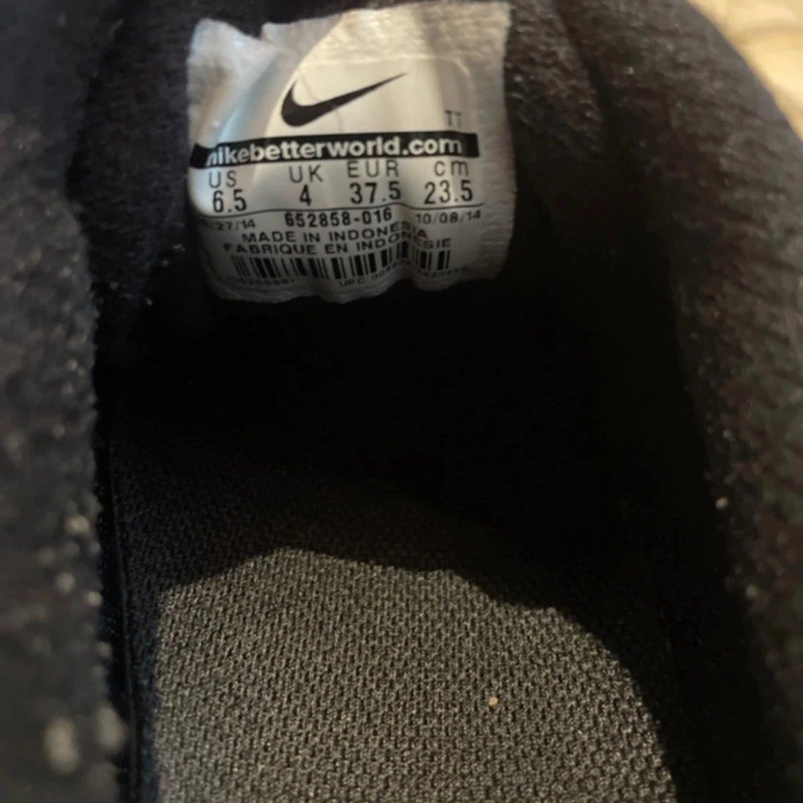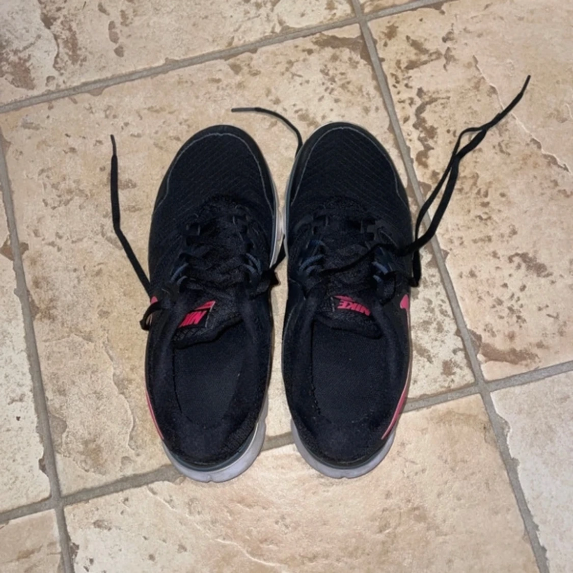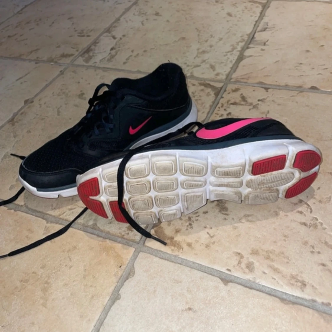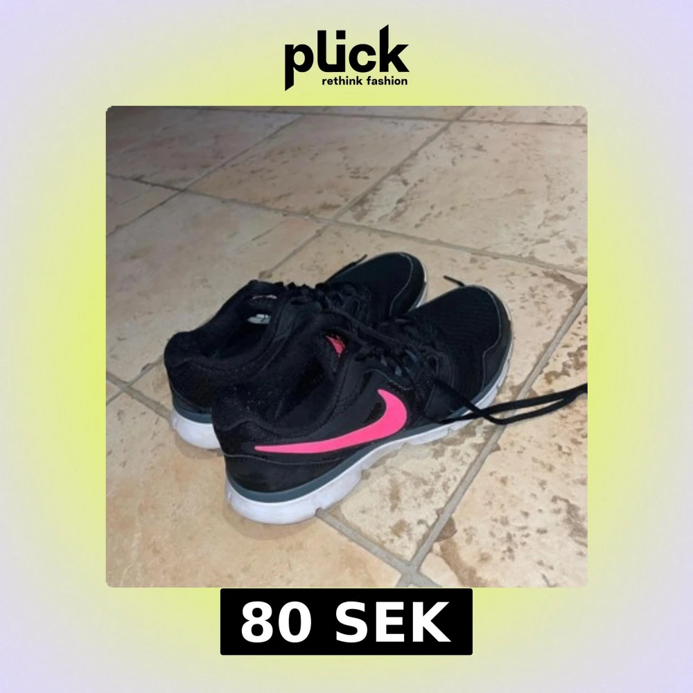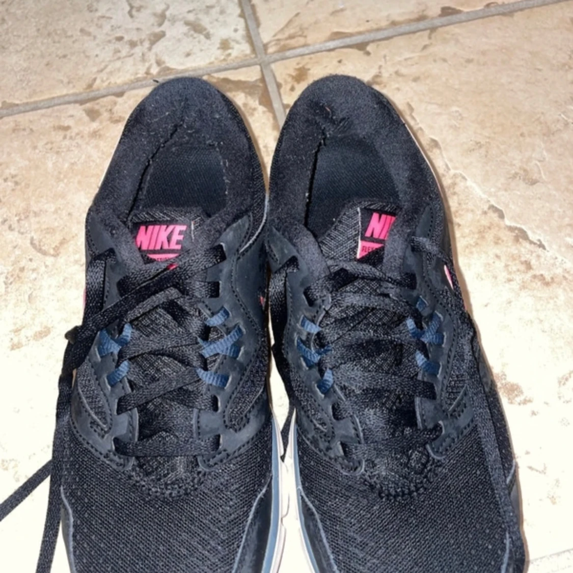 Snygga svarta Nike sneakers med rosa swoosh och detaljer. Skorna har vit sula, klassisk snörning och mesh-överdel för bra andningsförmåga. Perfekta för dig som gillar sportig stil och vill ha bekväma skor till vardagen. Lite slitna längs med hälen