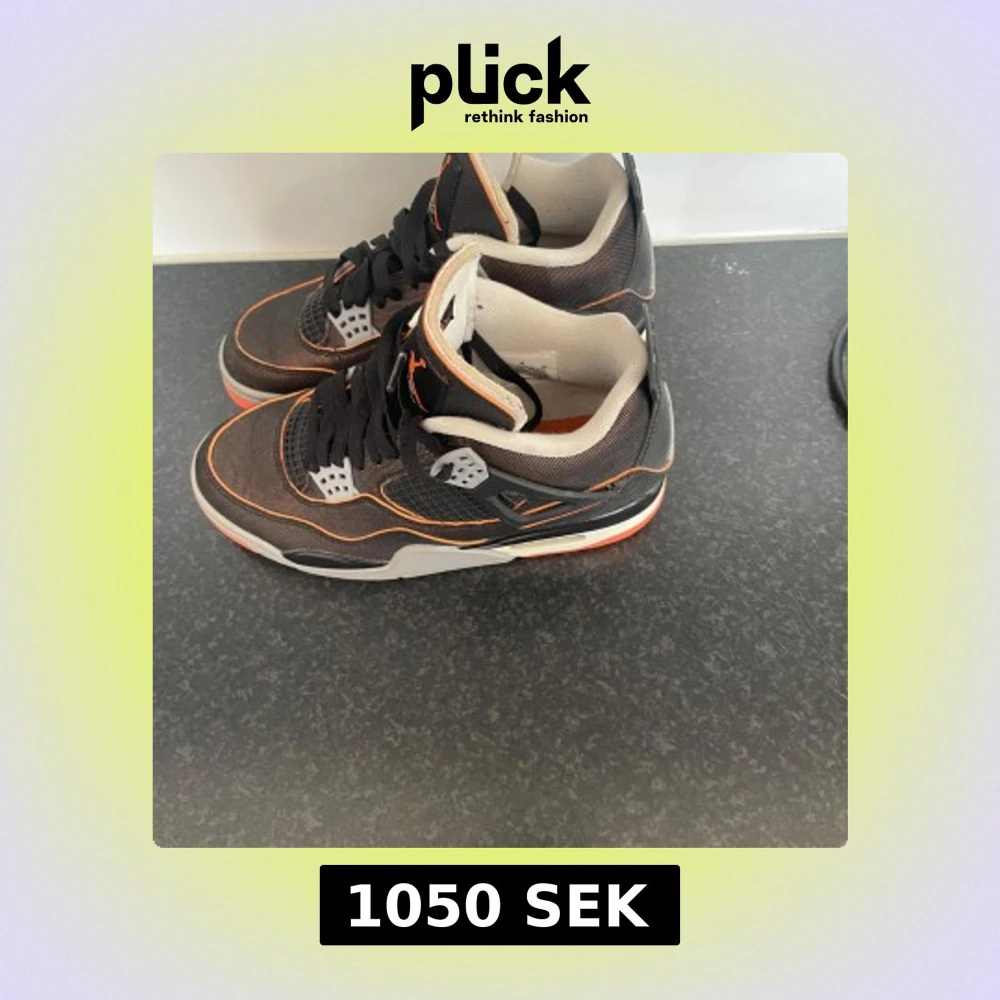 Säljer ett par svarta Nike Air Jordans med orangea detaljer och vit sula. Skorna har snörning, meshpaneler och den klassiska Jumpman-loggan på hälen. Perfekta för dig som gillar streetwear och vill sticka ut med snygga färgdetaljer.