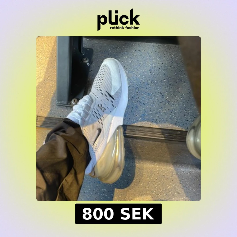 Säljer ett par Nike Air Max 270 sneakers i vitt med mesh-överdel och stora genomskinliga Air Max-sulan. Skorna har snörning, diskret svart swoosh och 270-detalj på sidan. Perfekta för dig som gillar sportig och modern stil.