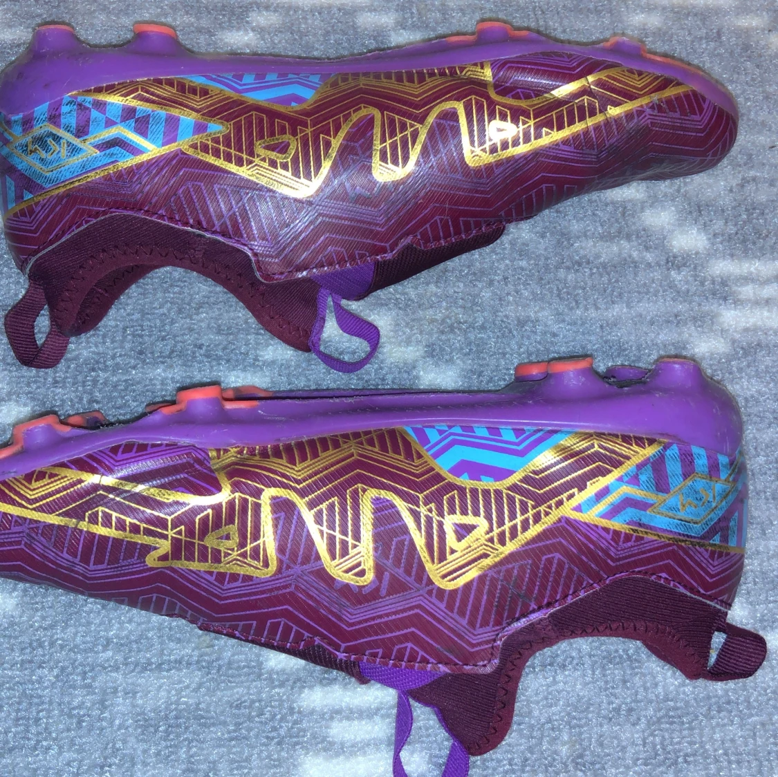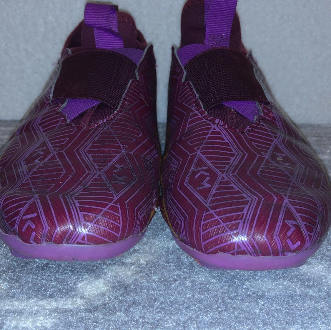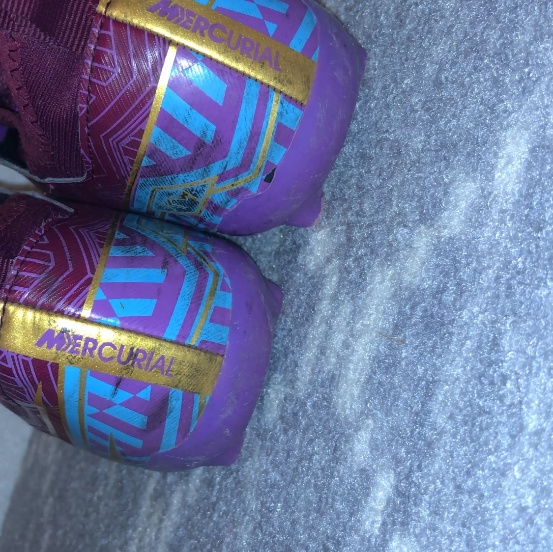 Säljer ett par Nike Mercurial fotbollsskor i en riktigt snygg lila och vinröd färg med guld- och blå detaljer. Skorna har ett grafiskt mönster, elastisk mudd och låg profil. Perfekta för dig som vill sticka ut på planen! Yttermaterial i syntet och plös utan snörning.