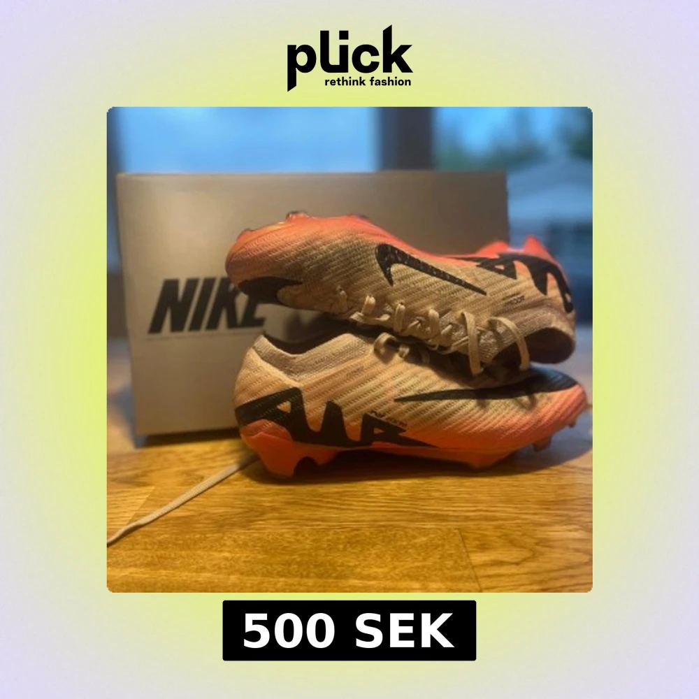 Säljer ett par Nike Air Zoom fotbollsskor i beige och rosa med svarta detaljer och stora Nike-loggor på sidorna. Skorna har snörning och en lätt, stickad ovandel i syntetmaterial samt rosa dobbar för bra grepp på planen. Perfekta för dig som vill sticka ut på matchen.