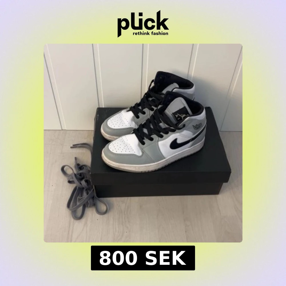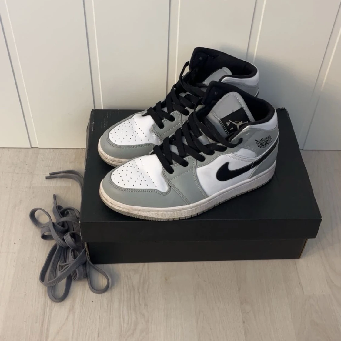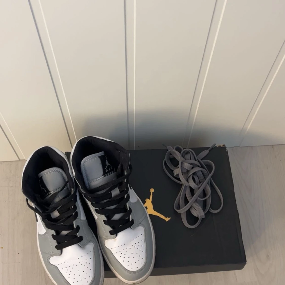 nike air jordan 1 mid skor, svart, vit och gråa. kommer gråa band med💓