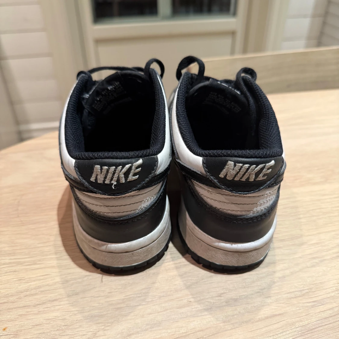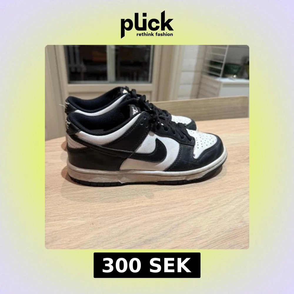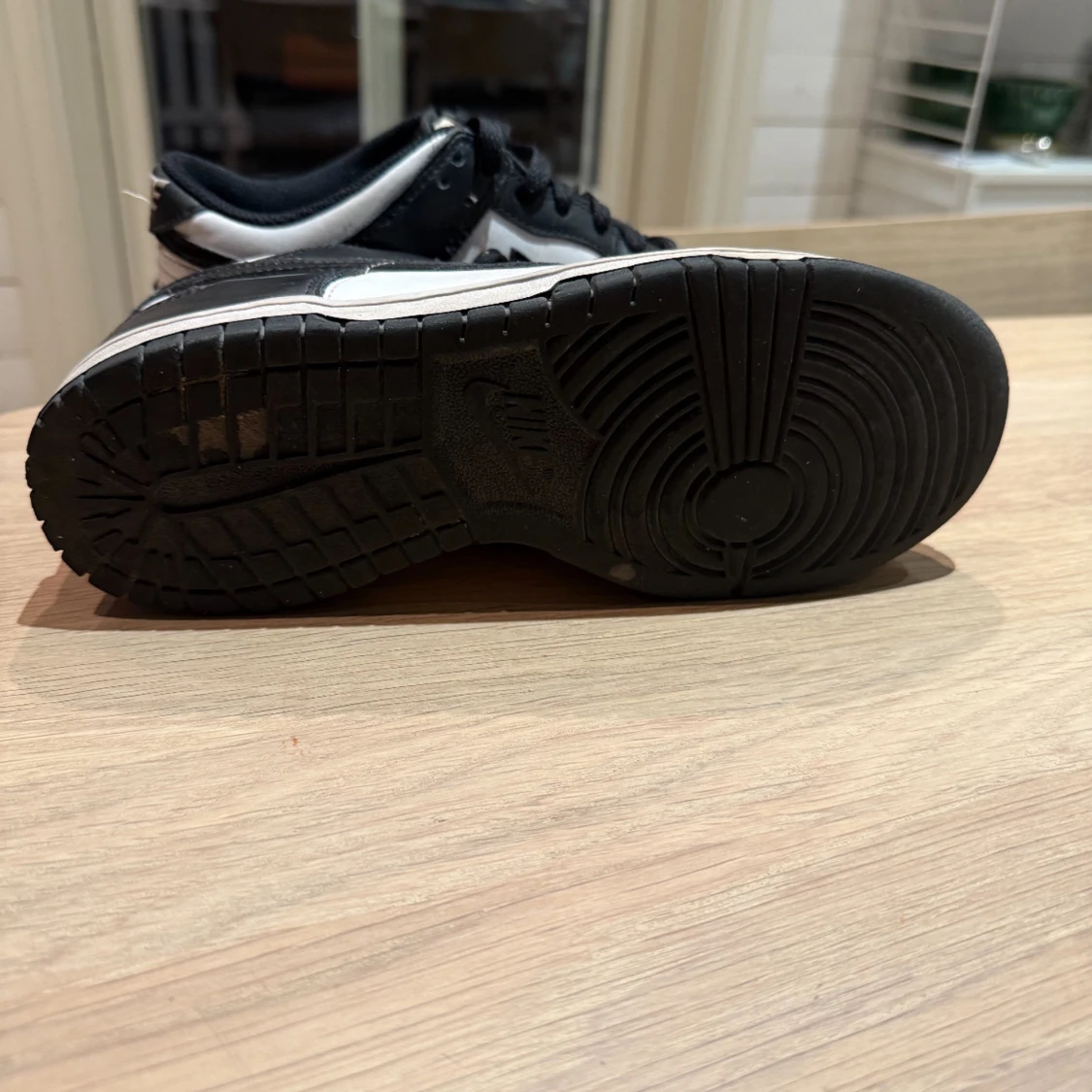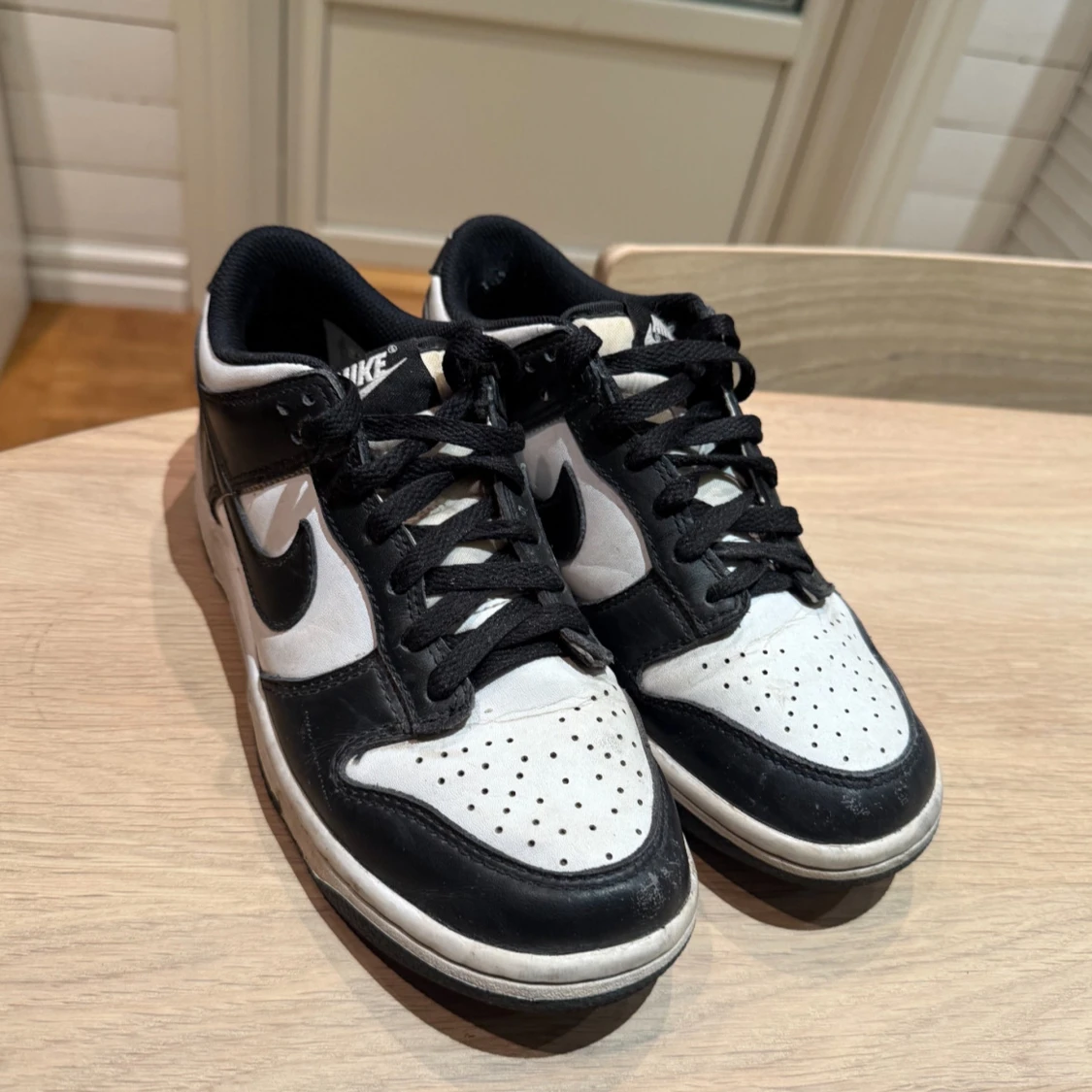 Snygga svartvita Nike Dunk sneakers med klassisk design. Skorna har en rund tå och snörning framtill. Perfekta för en stilren look.