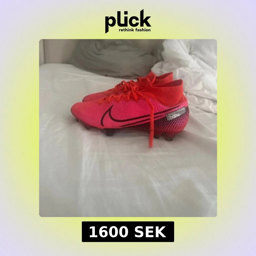 Säljer ett par grymt snygga fotbollsskor från Nike i stark rosa färg med svarta detaljer och logga på sidan. Skorna har snörning och en strumpliknande form runt ankeln för extra support. Ovandelen är i syntetmaterial och sulan har dobbar för bra grepp på planen.