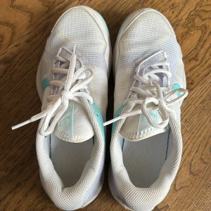Storlek 37,5 De är lite smutsiga eftersom jag har använt på idrotten i skolan. De funkar bra till både idrotten och till padel, jag har använt skorna till båda.