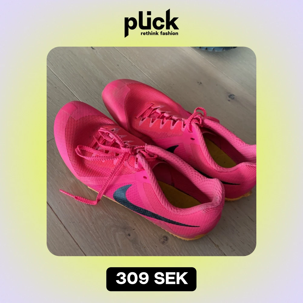 Säljer ett par rosa löparskor från Nike i bra skick. De har en svart swoosh-logga och är utrustade med spikar under sulan för extra grepp. Perfekta för löpning på bana. Skorna har snörning och är gjorda i ett lätt syntetmaterial. Man får en grön ”skruvmejsel” för att ta bort och sätta på spikarna på skorna.