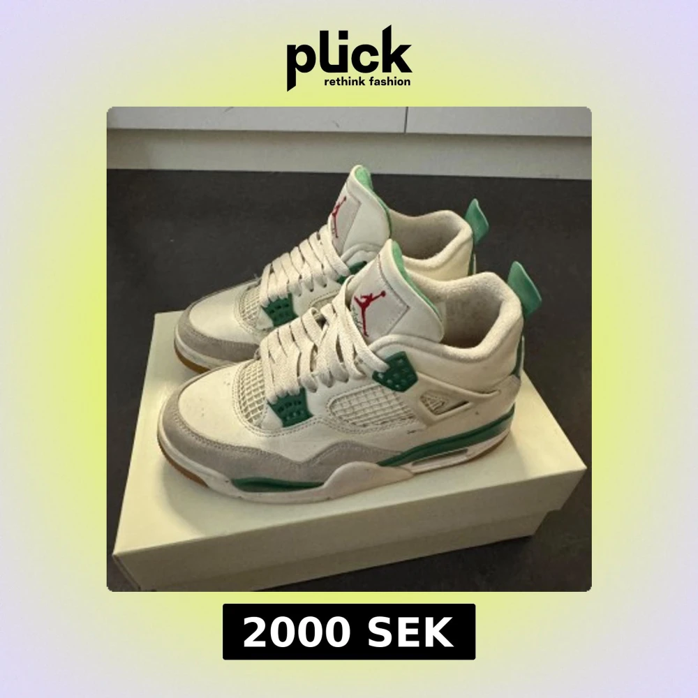 Nike SB Air Jordan 4 Pine Green med vit och grön färg, röda detaljer på tungan och klassisk meshpanel. Skorna har snörning, platt sula och är tillverkade i skinn och mocka. Perfekta för dig som gillar streetstyle och unika sneakers. Storlek 37,5 kvitto och original kartong medföljer. Bra skick och går att tvätta för att fräscha upp dem. (De är otvättade på bilderna)