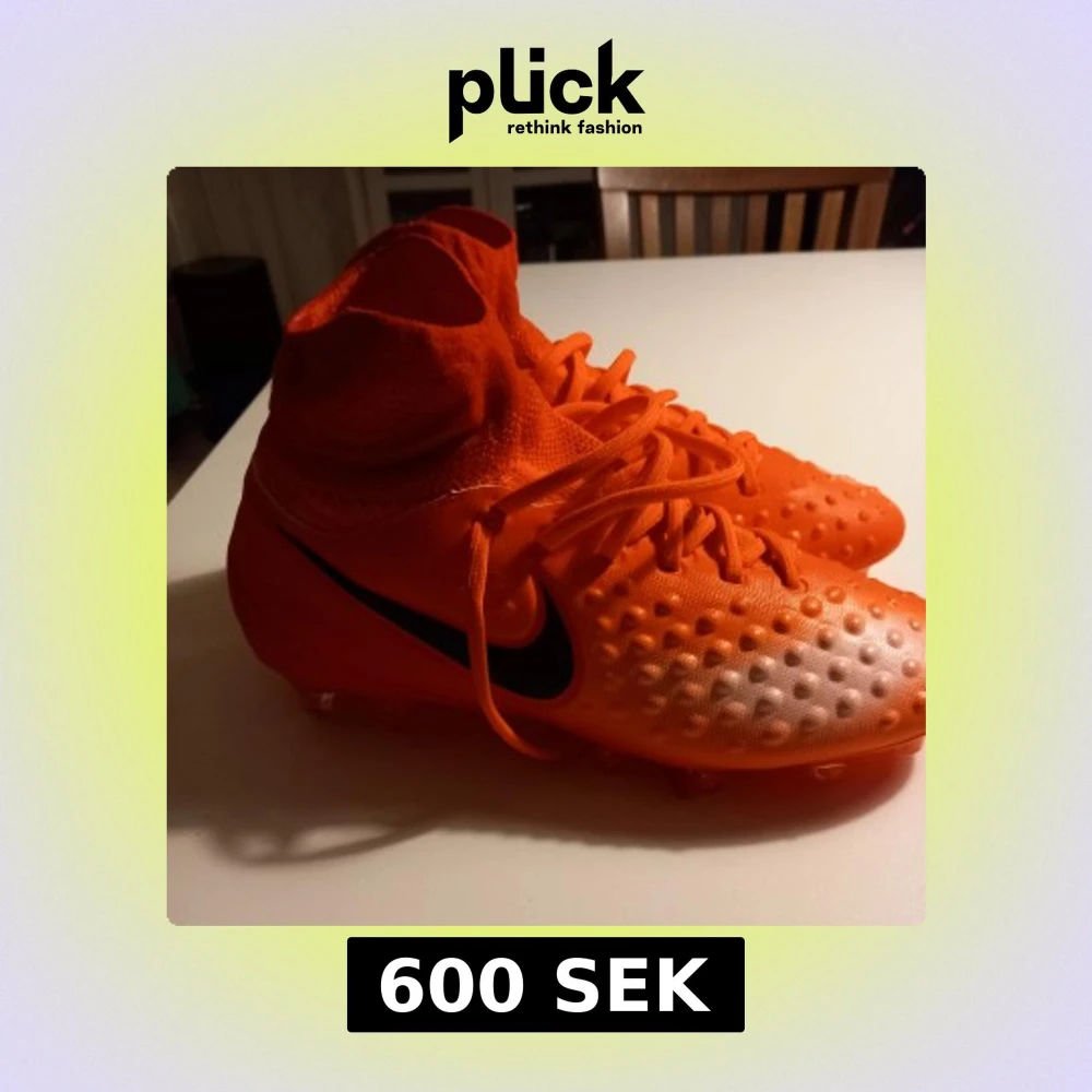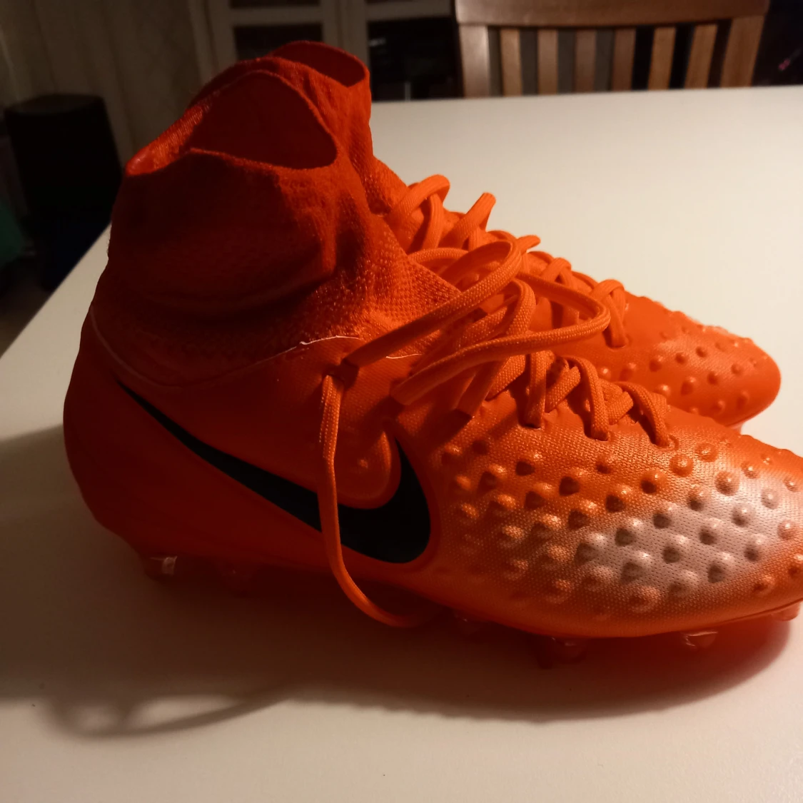 Snygga orange fotbollsskor från Nike magista med svart logga. Skorna har snörning och en hög ankelkrage för extra stöd. Perfekta för fotbollsplanen! Nya