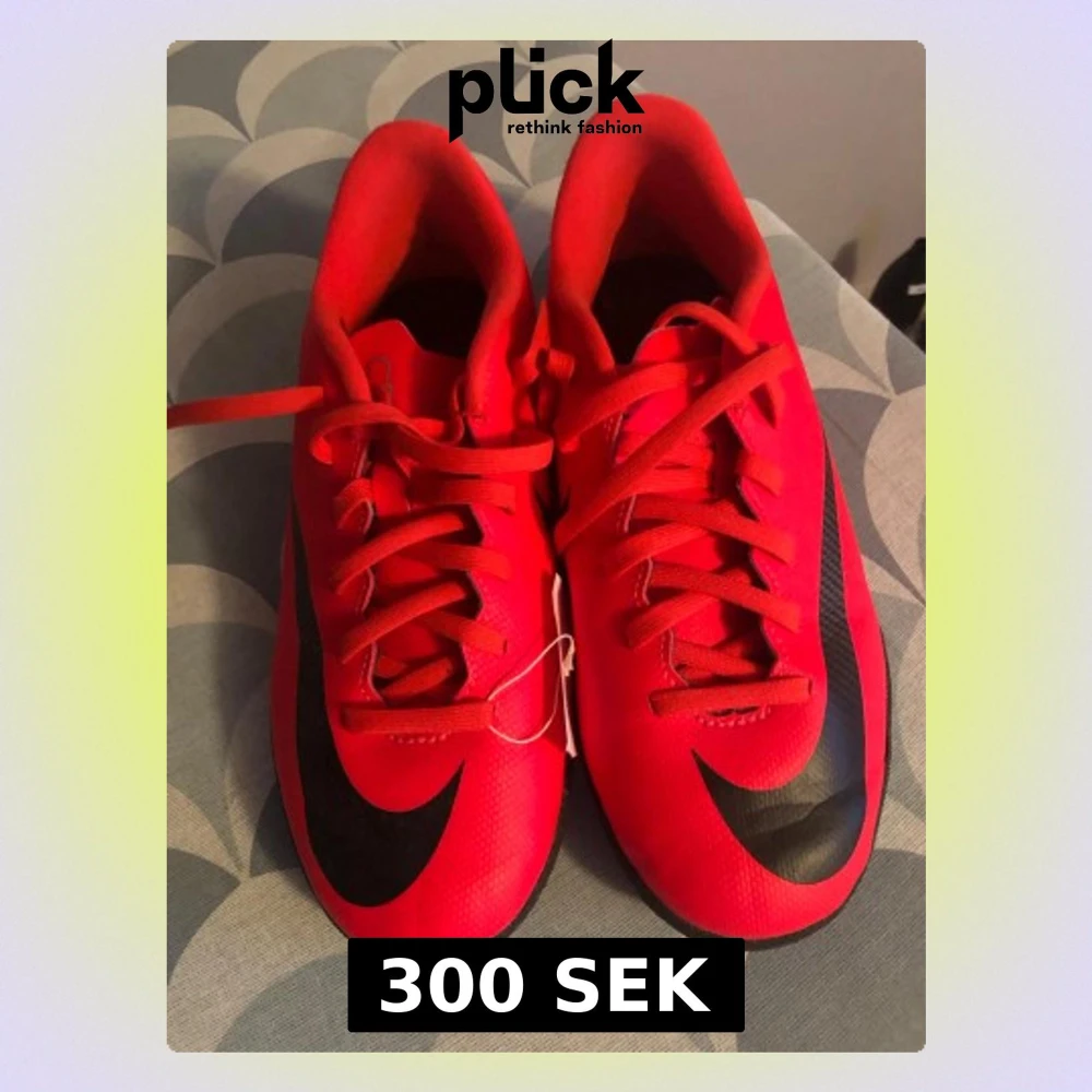 Säljer ett par riktigt snygga röda Nike fotbollsskor med svart swoosh på sidan. Skorna har klassisk snörning och är tillverkade i syntetmaterial för bra grepp och känsla på planen. Perfekta för dig som vill sticka ut på matchen!
