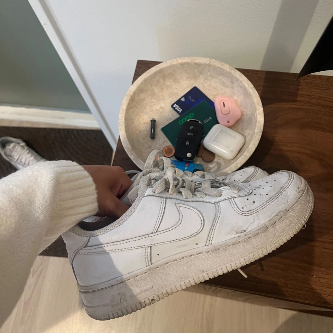 Klassiska vita Nike Air Force 1 sneakers med låg profil och rund tå. Skorna har snörning och är tillverkade i skinn med en platt sula. Perfekta för dig som gillar streetstyle och vill ha en ikonisk sneaker i garderoben.