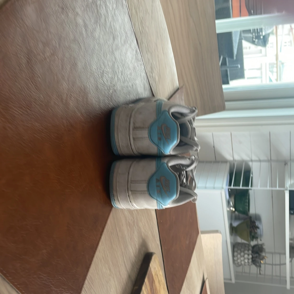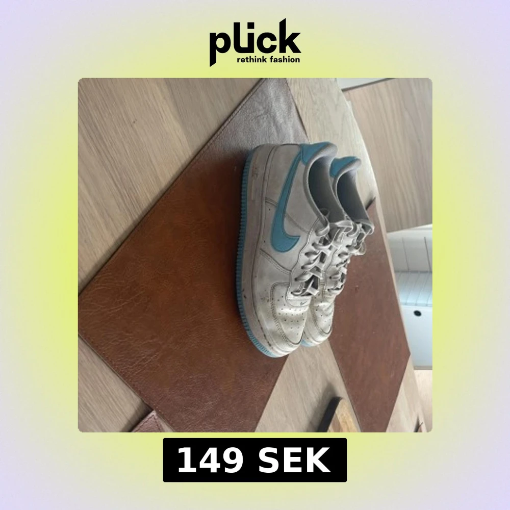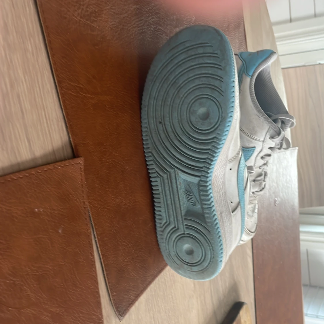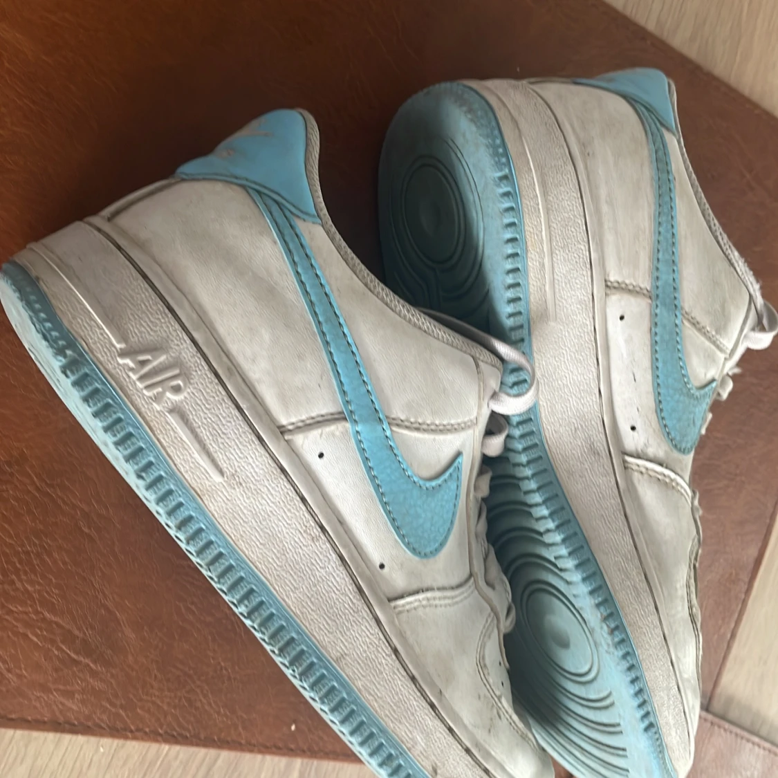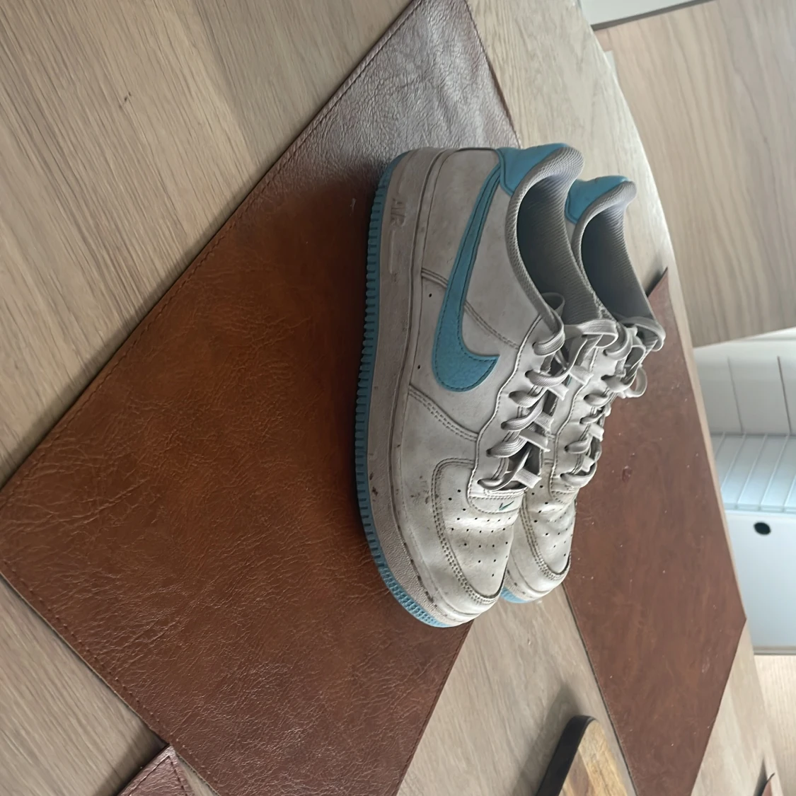 Säljer ett par klassiska Nike Air Force sneakers i vitt med snygga blå detaljer. Skorna har snörning och en rund tå, perfekt för en stilren look. Den blå sulan och swoosh-loggan ger en fräsch touch.