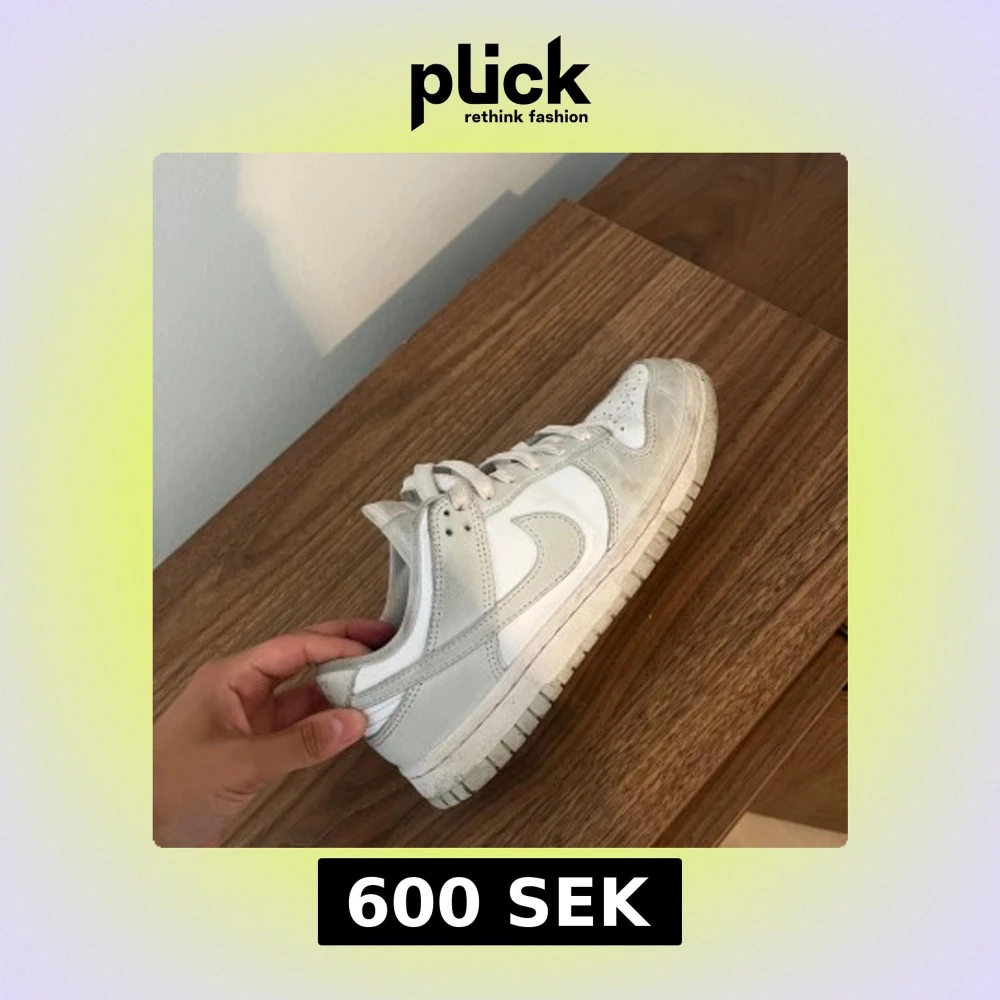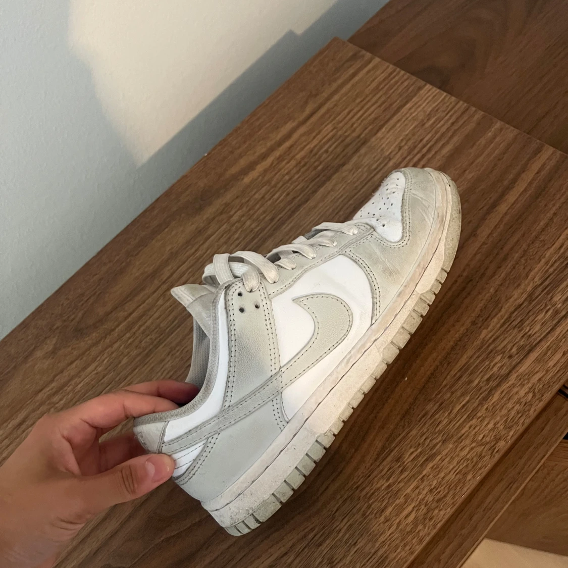Nike Dunk Low sneakers i vitt och ljusgrått med klassisk Swoosh-logga på sidan. Skon har snörning, rund tå och platt sula. Ovandelen är i skinn och syntet, perfekt för en clean och stilren look.
