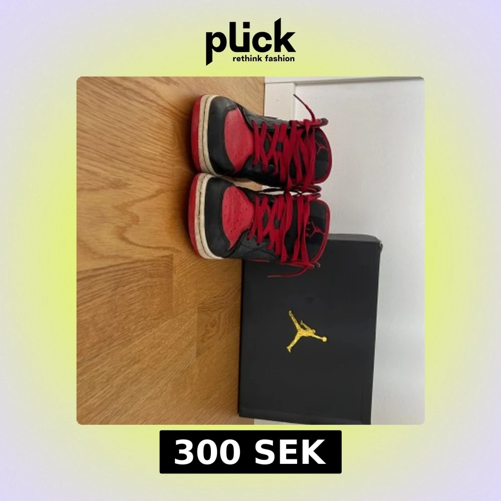 Snygga Nike Air Jordans i klassisk röd och svart färgkombination. Skorna har snörning och en rund tå, perfekt för en sportig look. De kommer med originalkartong. De är väl använda och har en slitning på sulan, se bild.