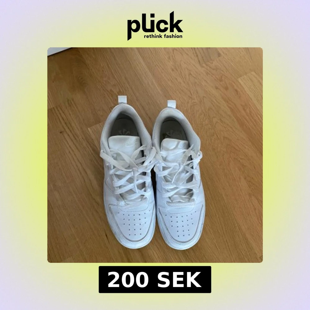 Säljer ett par helvita Nike sneakers med klassisk design och snörning. Skorna har perforerade detaljer framtill för ventilation och en platt sula som ger bra komfort. Passar perfekt till en sportig och stilren look.