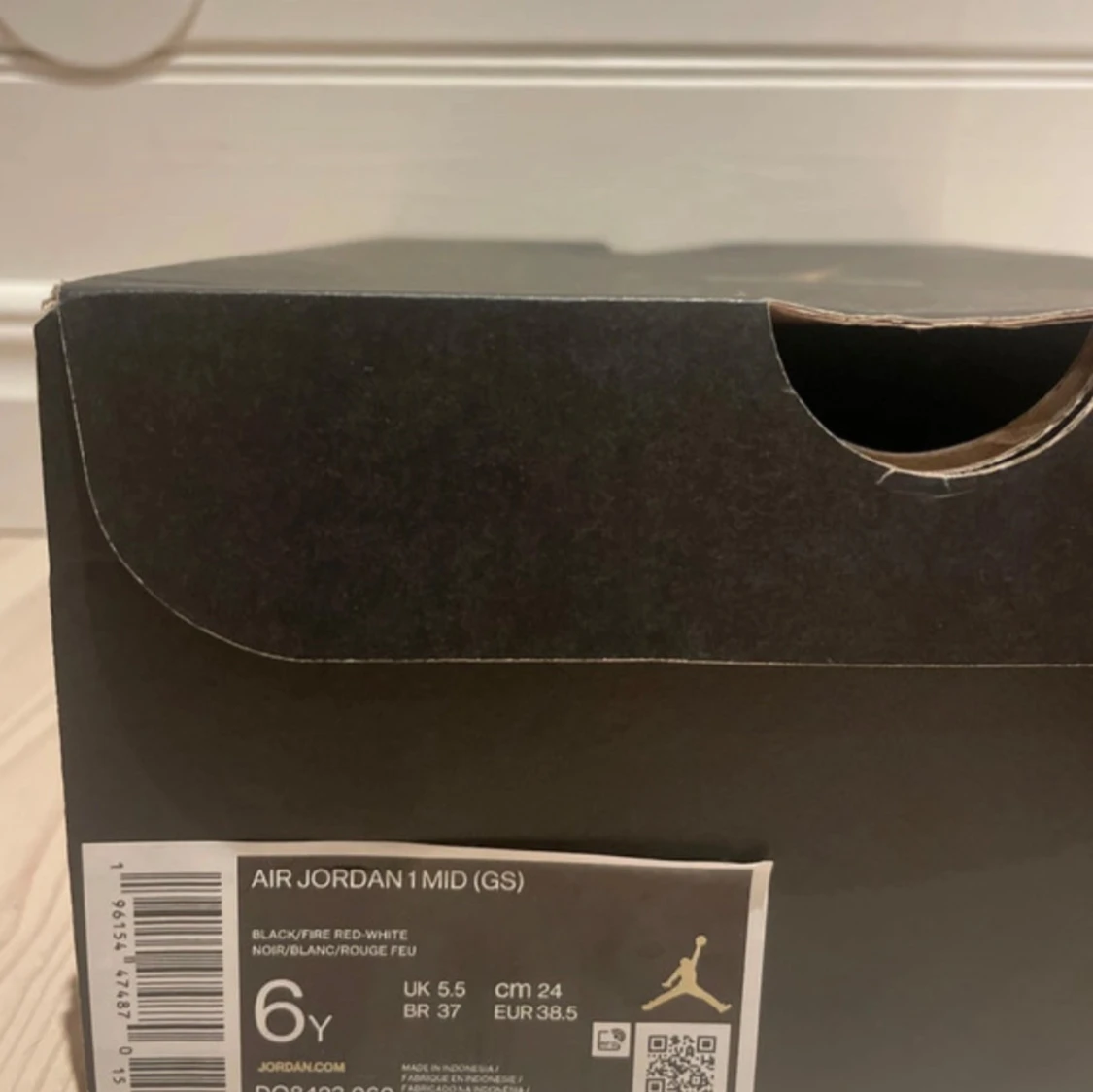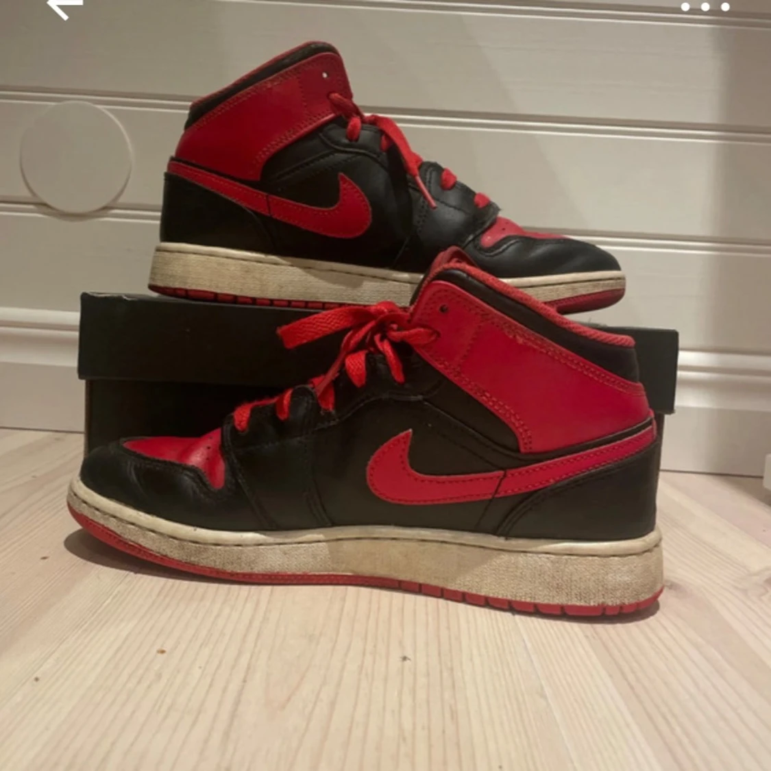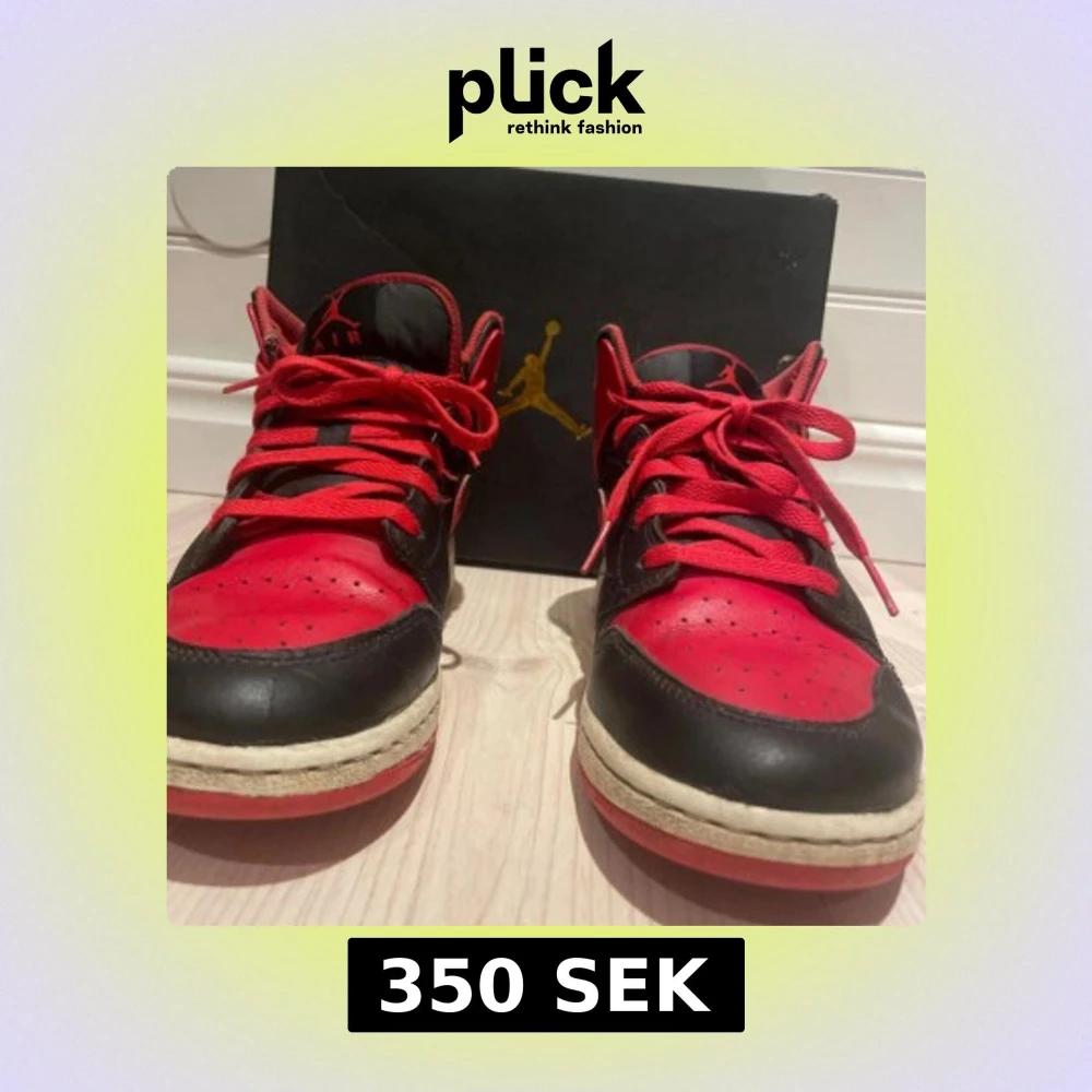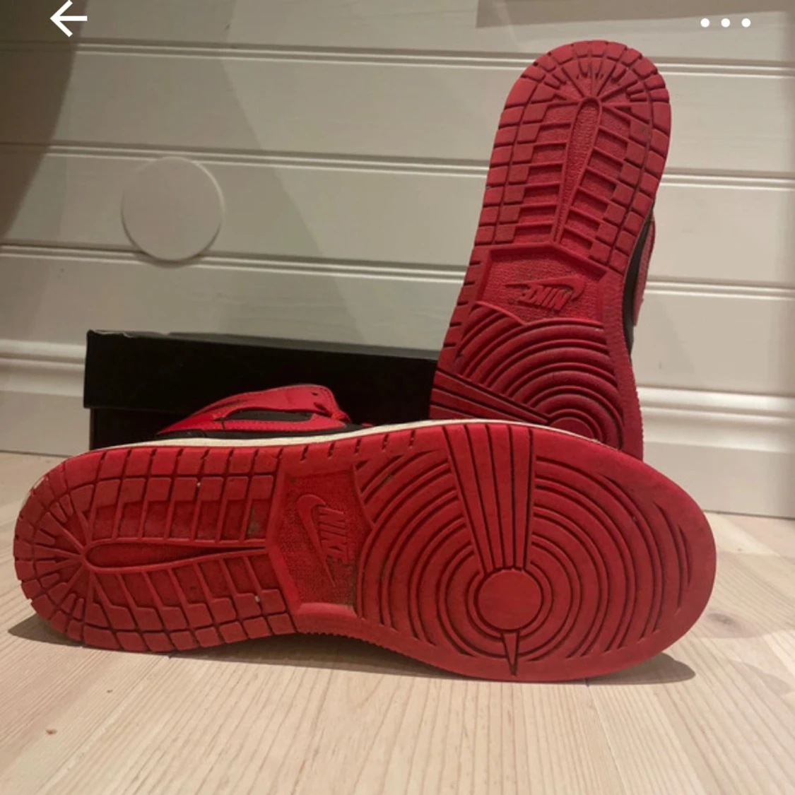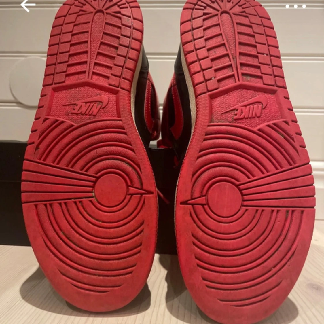 Säljer ett par ikoniska Nike Air Jordan 1 Bred sneakers i svart och rött skinn med klassisk röd swoosh och snörning. Skorna har rund tå, platt sula och mids höjd. Perfekt för dig som vill ha en streetstyle-vibe med retro känsla. Box medföljer.