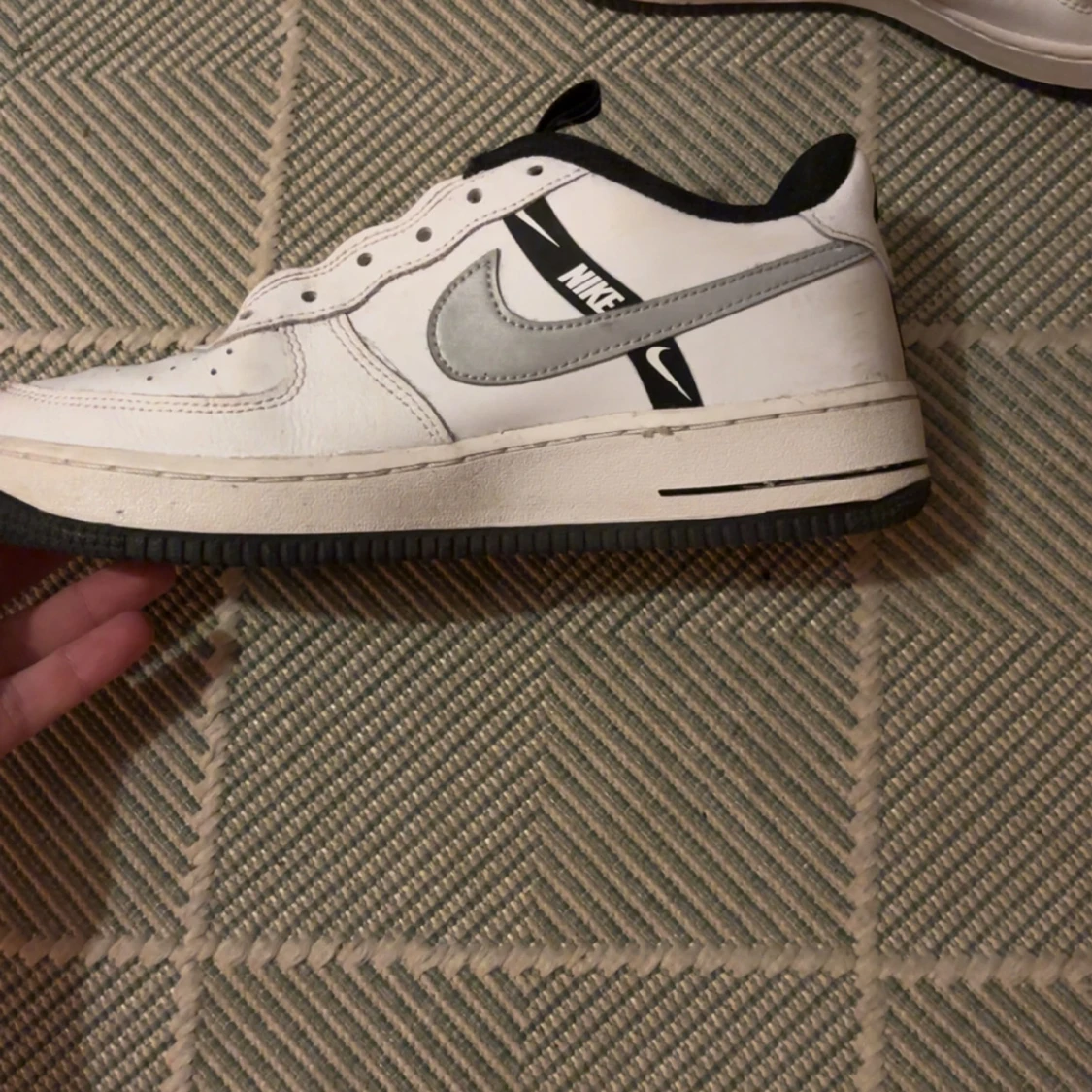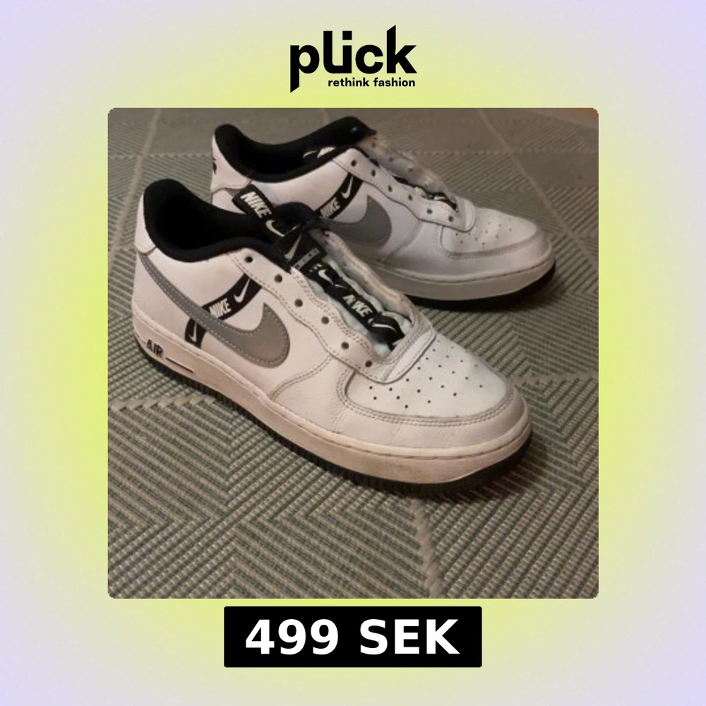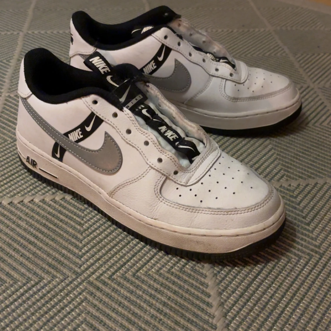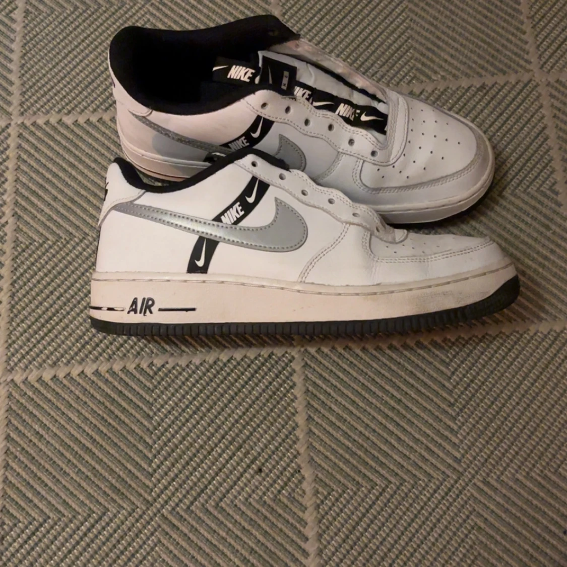 Säljer ett par Nike Air Force 1 sneakers i vitt skinn med grå swoosh och svarta detaljer. Skorna har svart innersula, svartvit Nike-logga på snörningen och svart sula. Klassisk låg modell med perforerad tå och tydliga Air-detaljer på sidan.