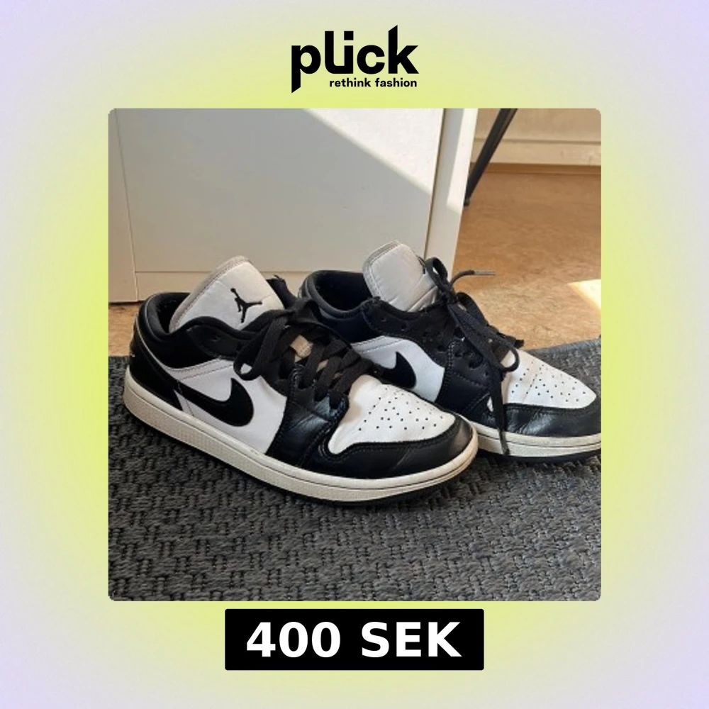 Snygga Nike Air Jordans i klassisk svart och vit färgkombination. Skorna har en låg profil med snörning och den ikoniska Nike-loggan på sidan. Perfekta för en stilren look. Storlek 38,5