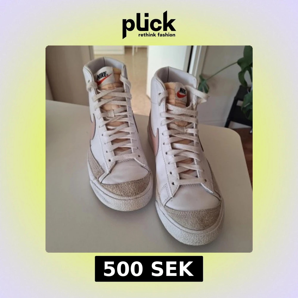 Nike Blazer Mid sneakers i vitt skinn med rosa detaljer. Klassisk hög modell med snörning och retrovibbar. Tjock vit sula med fiskbensmönster undertill. Perfekta för dig som gillar stilrena och tidlösa sneakers med en twist.