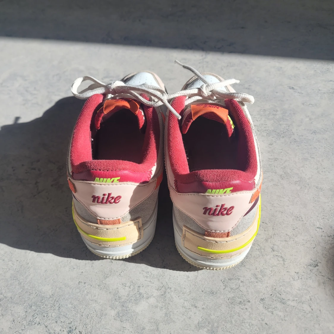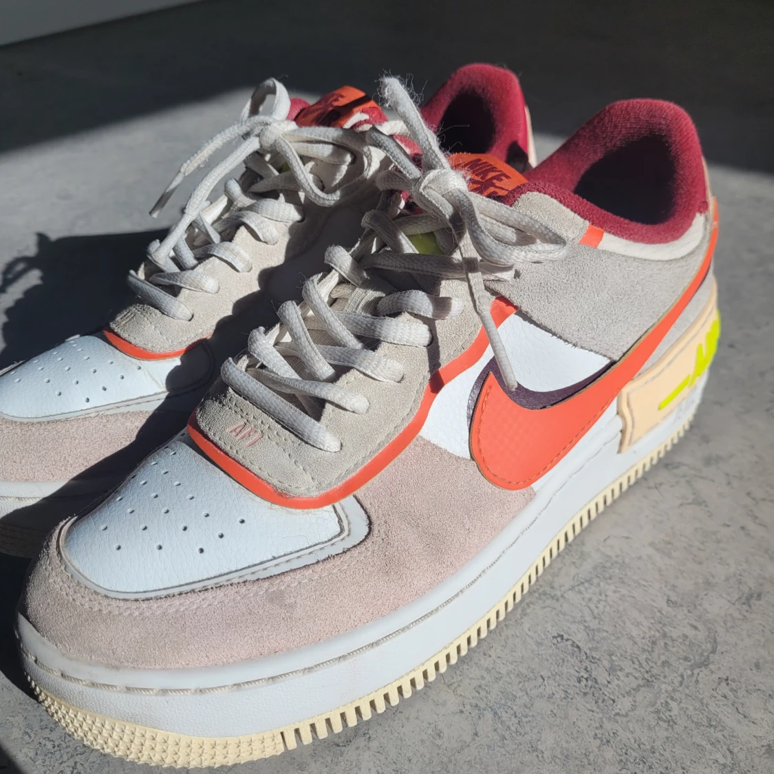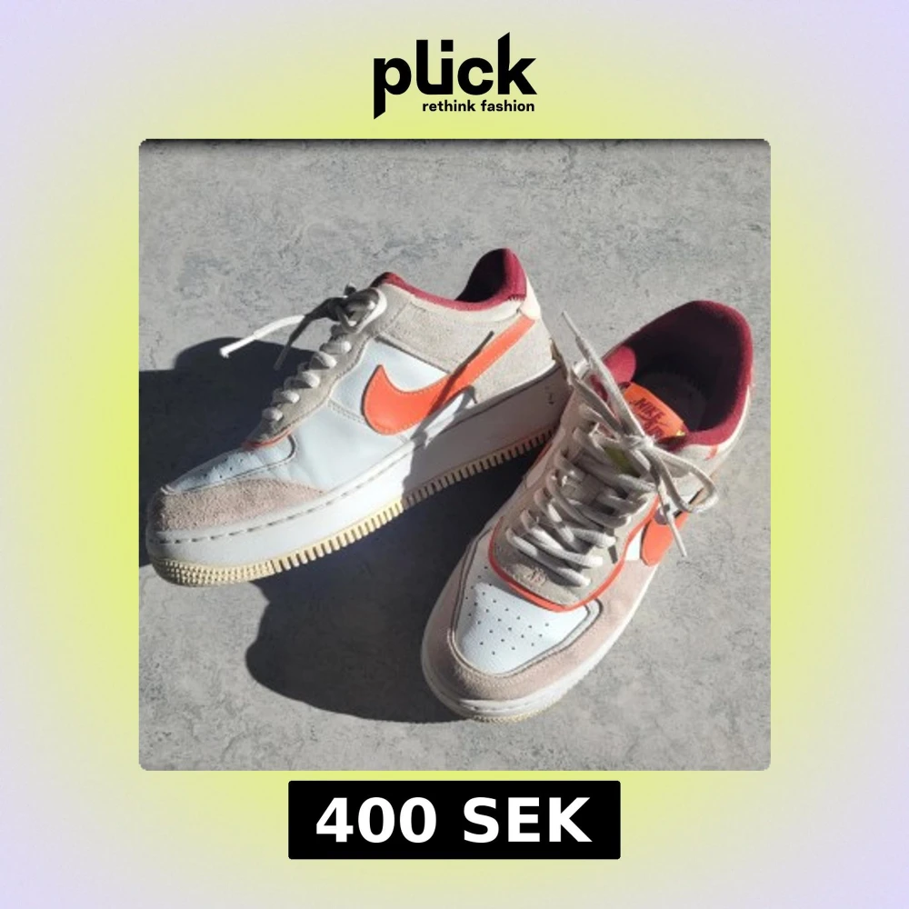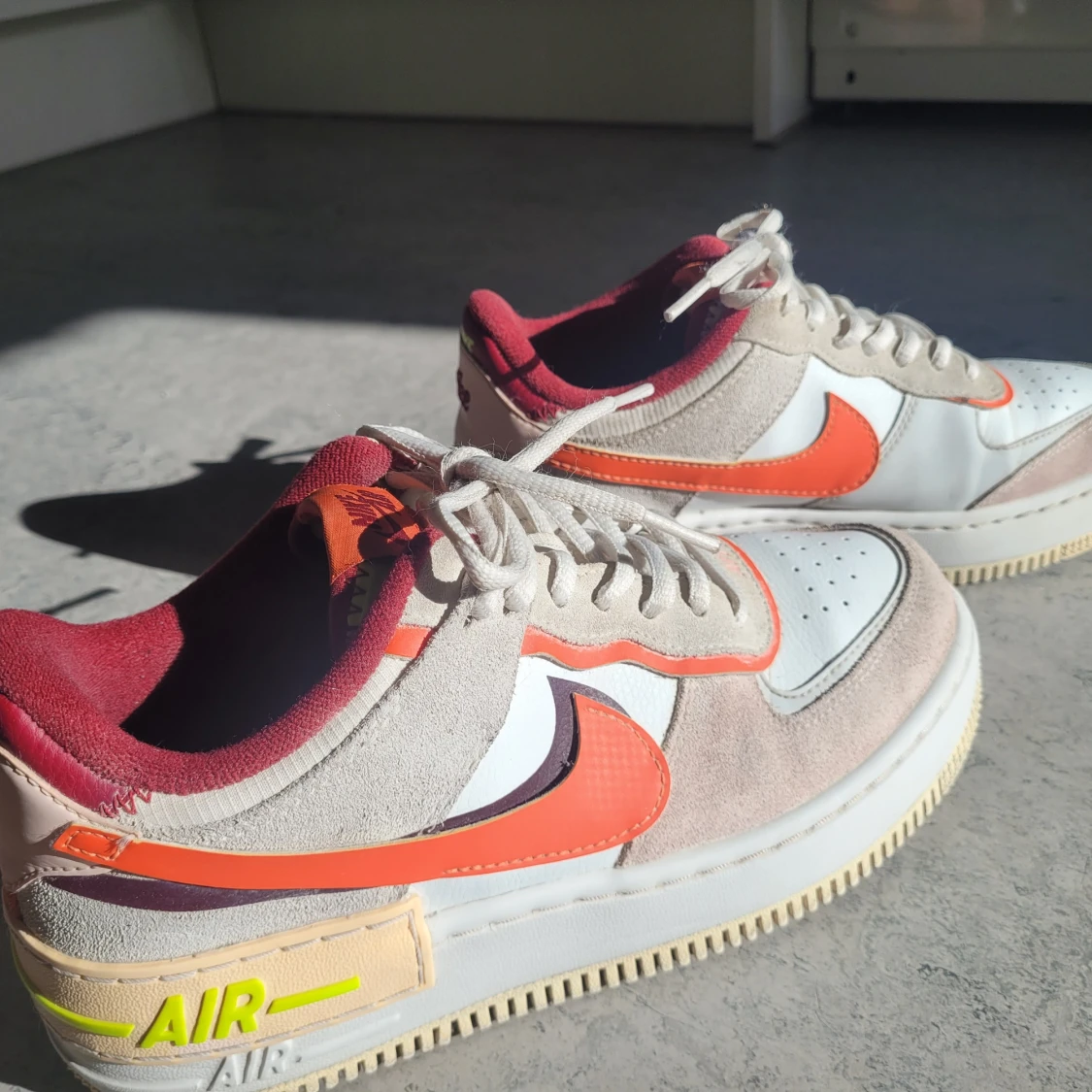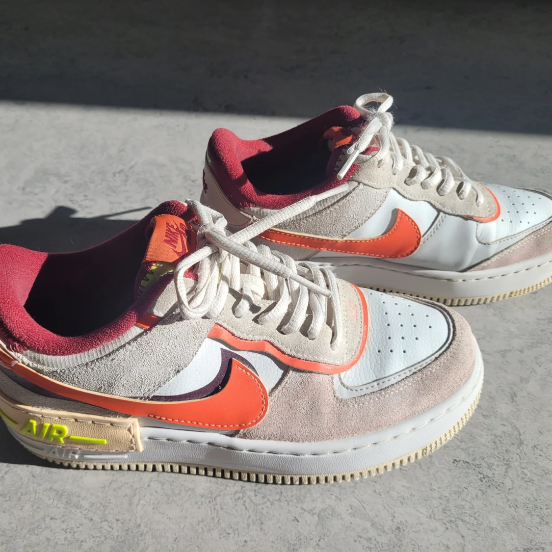 Nike Air Force 1 sneakers i vitt och beige skinn och mocka, med orange swoosh och detaljer. Insidan är vinröd och sulan är vit med beige undersida. Klassisk modell med snörning och AIR-text i gult på hälen. Skorna är i god kondition och har inga skador.