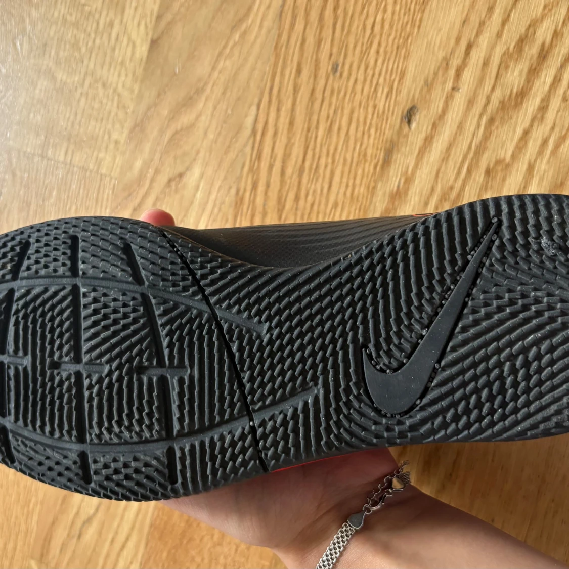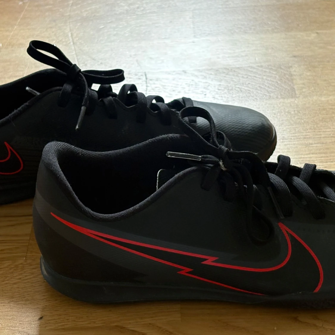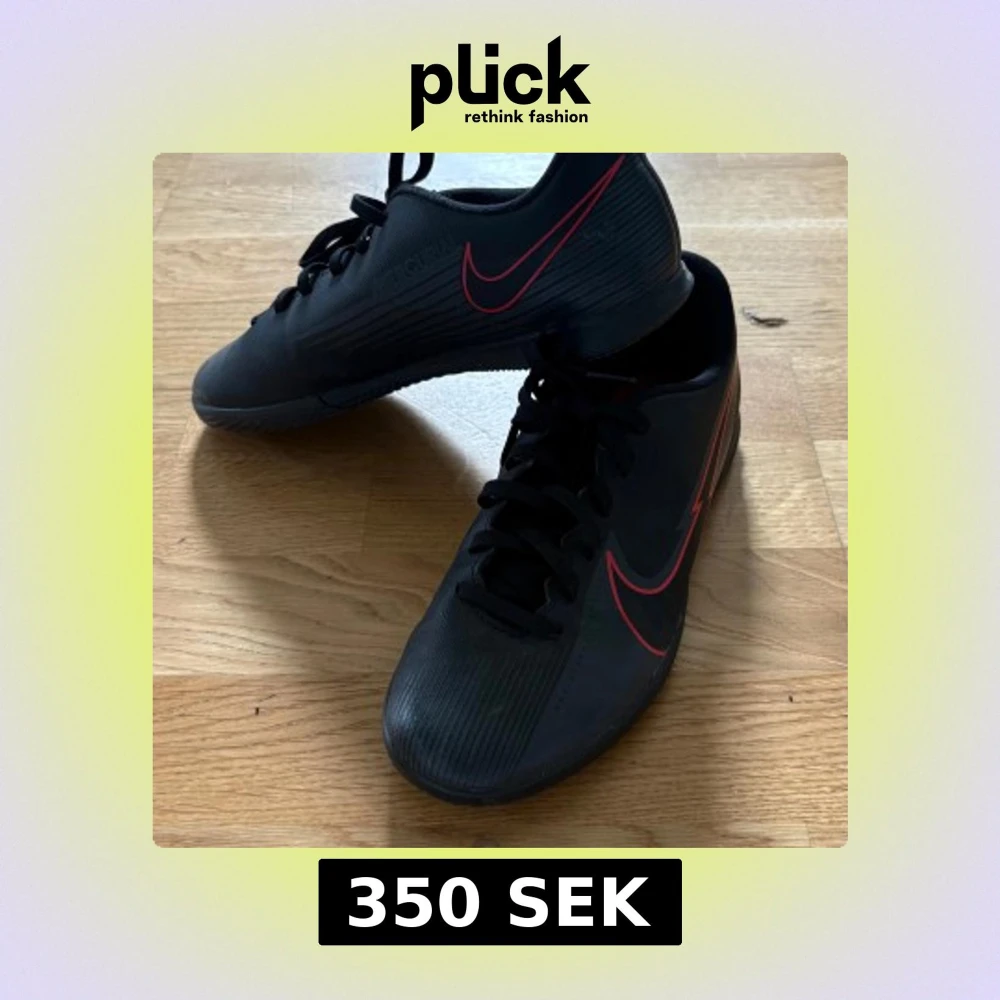 Svarta Nike Mercurial fotbollsskor med röda detaljer och klassisk Swoosh-logga på sidan. Skorna har snörning och en slitstark syntetsula med grepp, perfekt för inomhusspel. Snygg, sportig design som sticker ut på planen.