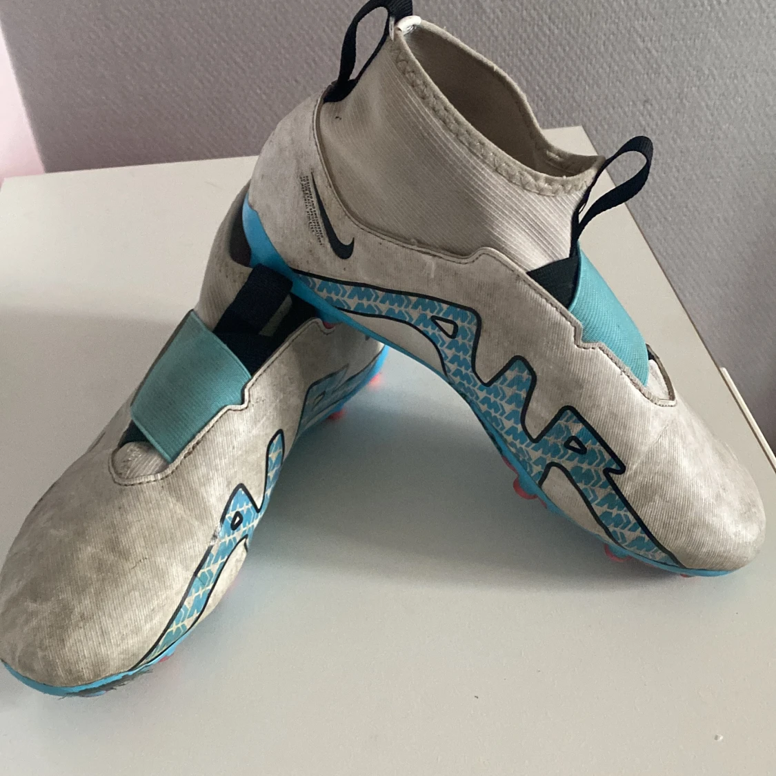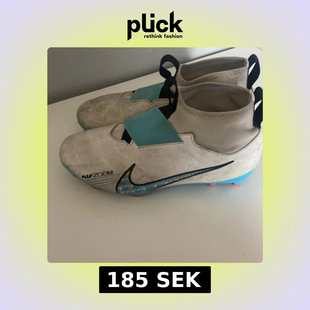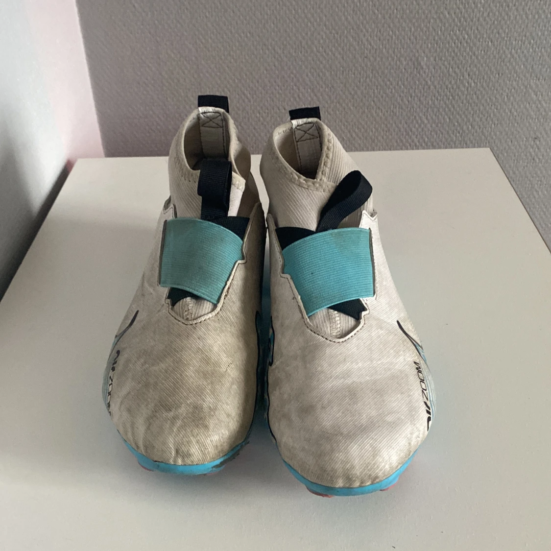 Säljer ett par Nike Air Zoom fotbollsskor i vitt med blå detaljer och svart swoosh. Skorna har en elastisk mudd, bred kardborre över vristen och mönstrad sula i blått och rött. Perfekta för dig som vill sticka ut på planen!