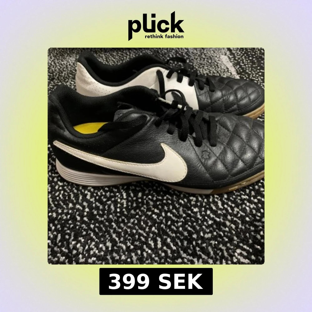 Säljer ett par Nike Tiempo fotbollsskor i svart och vitt med klassisk Swoosh-logga på sidan. Skorna har snörning, rund tå och är tillverkade i skinn för bästa känsla på planen. Perfekta för dig som vill ha stilrena och bekväma skor till inomhusfotboll.